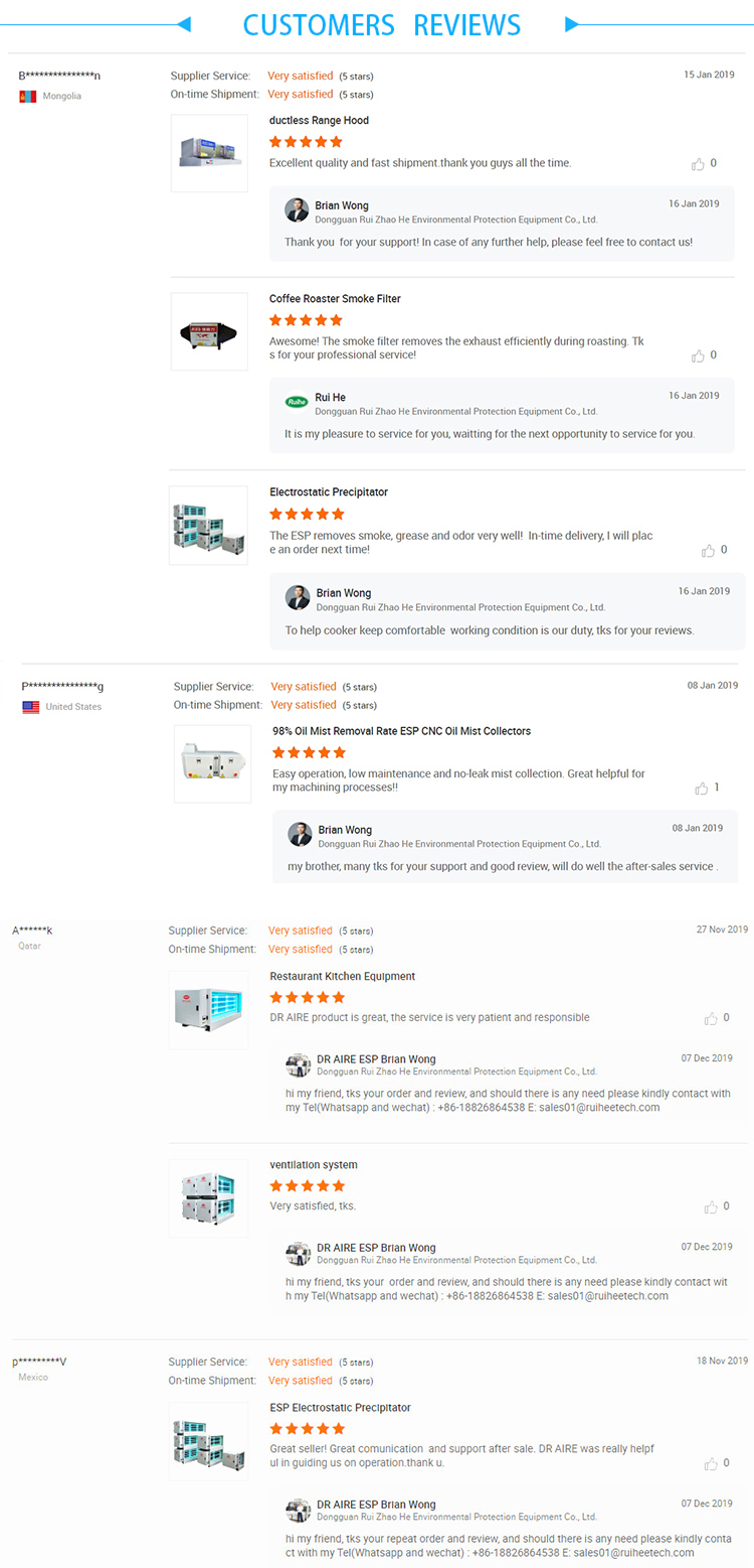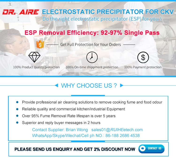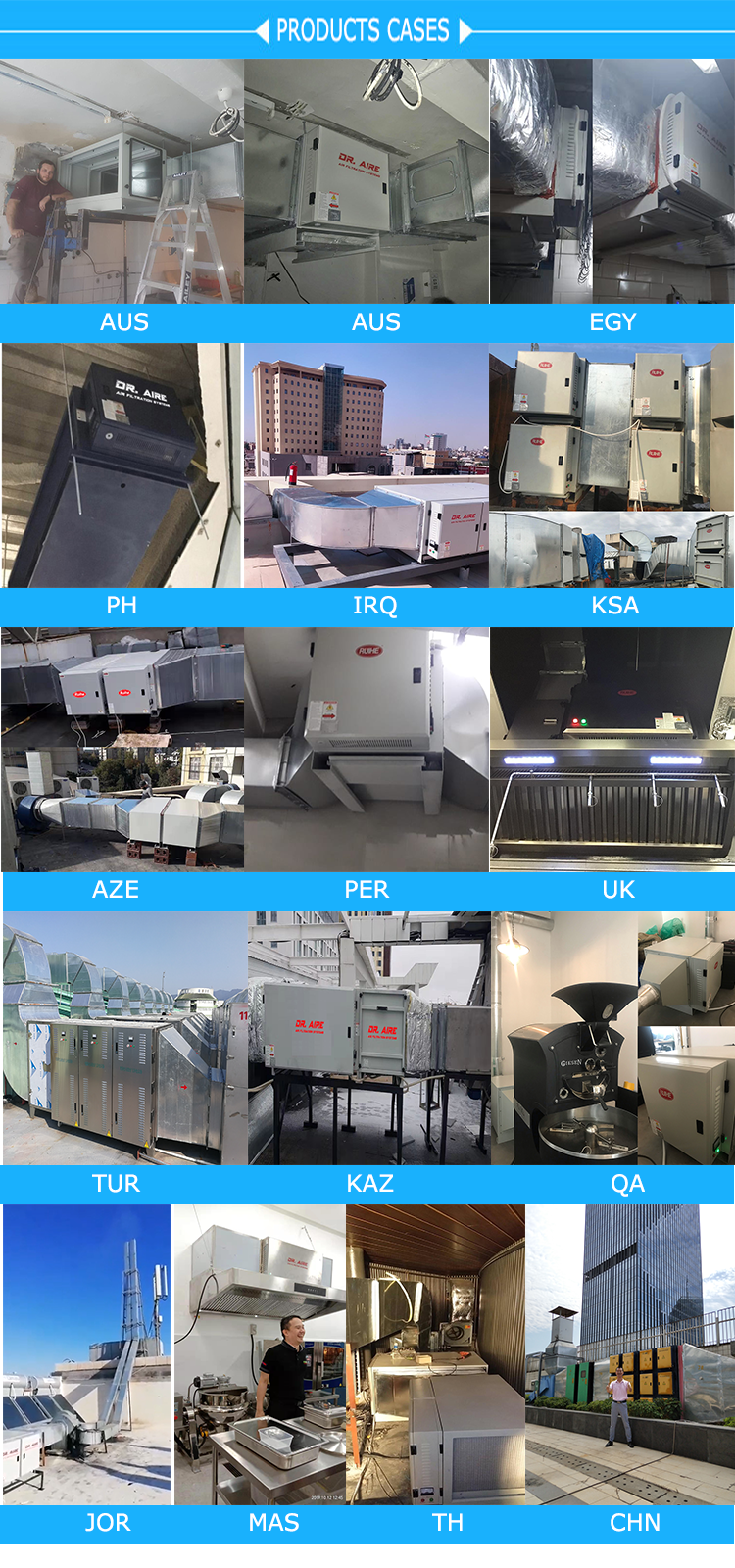 DR AIRE is our brand, main products: Electrostatic Precipitator (ESP) for Commercial Kitchen, Mobile Cooking Station, Grill Cart with Smoke Filter, Industrial ESP, Ductless Range Hood, Coffee Roaster Smoke Filter, UV Lamp, HVAC UV, activated carbon filter, CNC oil mist collector, etc.