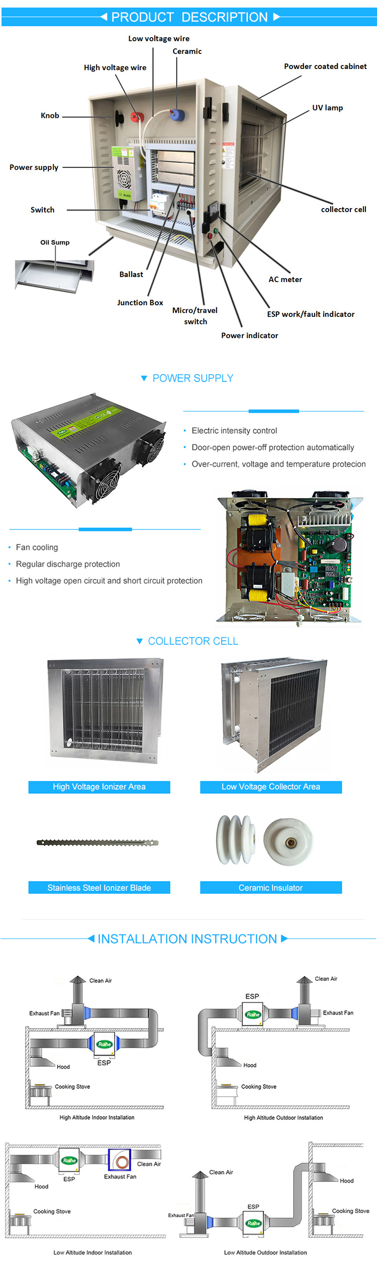 Electric intensity automatic adjustmentThe control function ensures that the kitchen ESP collector unit maintains a high purification rate after prolonged use.