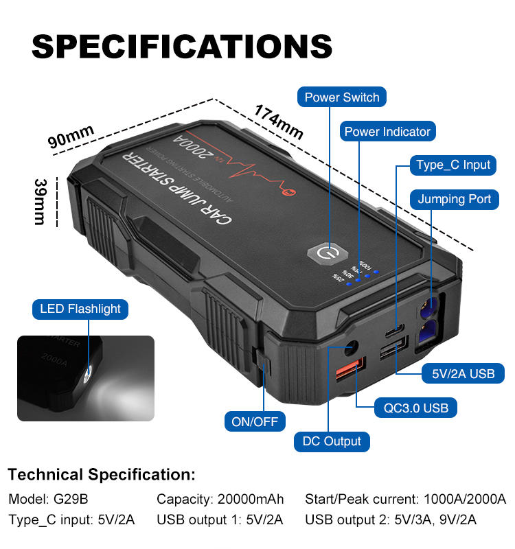 | enter: | 5V/3A Type C | Peak current: | 2000A |