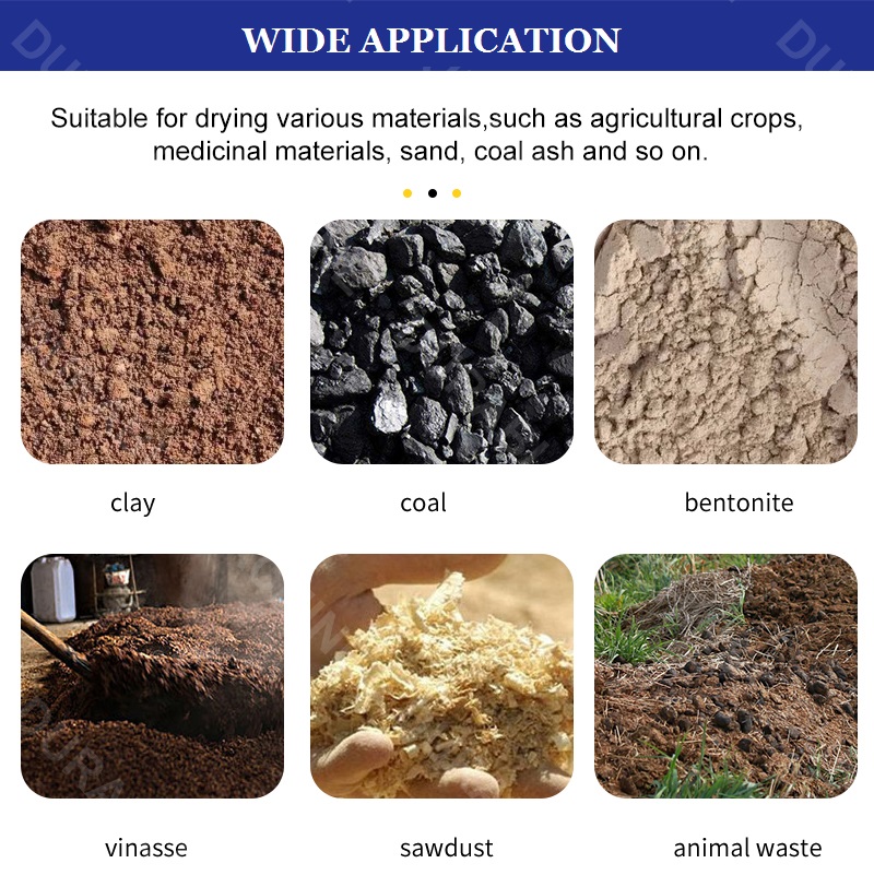 It can be widely used for drying materials in the fields of river sand, sludge, coal slime, sawdust, sand, bean curd residue, chicken manure, organic fertilizer, feed, traditional Chinese medicine residue, distiller's grains, vinegar granules, etc.