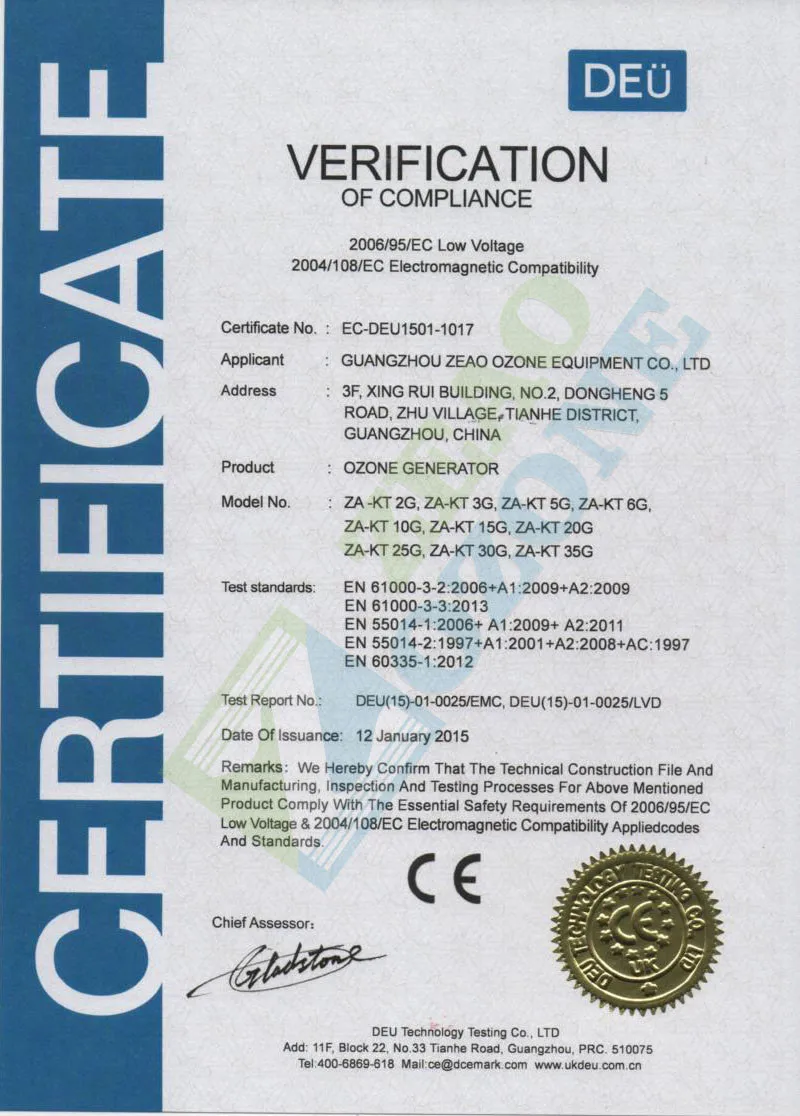 1) CE certificate for 2g/hr, 3g/hr,...30g/hr, or even higher capacity 40g/hr, 50g/hr,