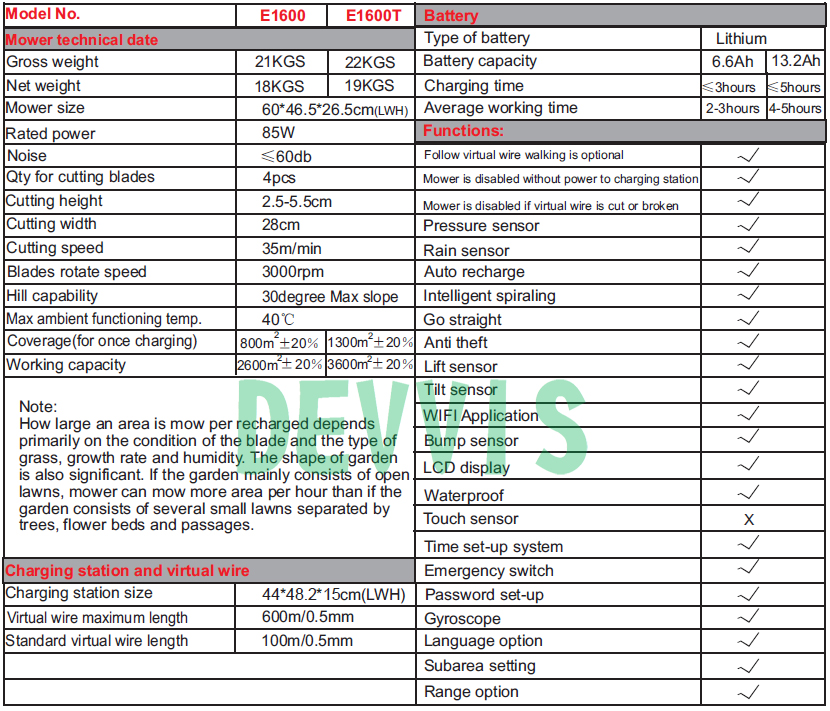 DEVVIS Robotic Lawnmower E1600T Information: