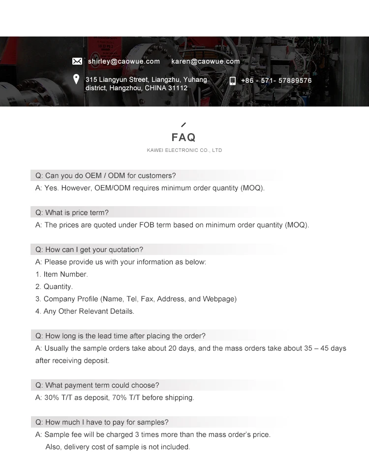 Kawei Electronic Co., Ltd employs more than 200 staff including a R&D team full of innovative spirit. Our possession of first-ranking professional production equipment and testing equipment enables us to ensure quality of every procedure of production. From digital controlled processing to finished products, we have a set of complete production and testing processes. We also have our own cold metal processing workshop with digital equipment and first-ranking tooling to ensure quality of production.