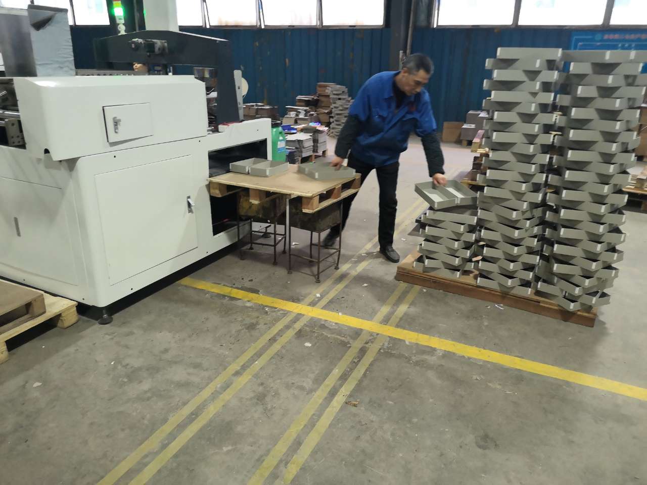 Slotted or die-cut cardboard is conveyed to the gluing area using a conveyor belt. It feeds steadily and faster.