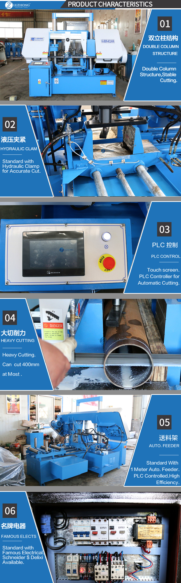 PLC control 1 saw blade Hydraulic Workholding binding vise material support cooling system working lamp Operation Manual | Automatic blade breakage control Rapid fall protection Hydraulic blade tension Automatic chip removal device Various blade line speeds Blade guard Wheel cover opening protection CE standard electrical equipment |
