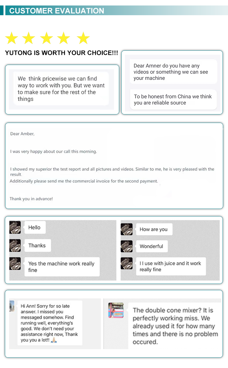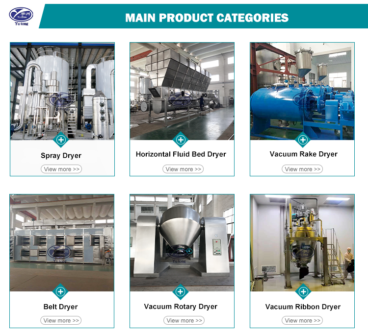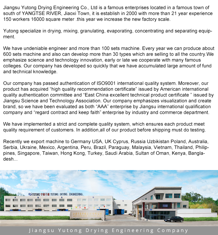 Jiangsu Yutong Drying Engineering Co., Ltd. is a famous enterprise located in Jiaoxi Town, a famous town in the south of the Yangtze River. This year we added a new factory size. Yutong specializes in drying, mixing, granulation, evaporation, concentration and separation equipment. We have undeniable engineers and over 100 machines. The annual production equipment is about 600 sets, and more than 30 kinds of models can be developed, which are exported to the whole country. Attaches great importance to scientific and technological innovation, and has successively cooperated with many well-known colleges and universities. The company has developed rapidly and accumulated a lot of capital and technical knowledge. The company has passed the lSO9001 international quality system certification, and the products have obtained the "Quality Recommendation Certificate" issued by the American International Quality Certification Commission and the "East China Excellent Technical Product Certificate" issued by the Jiangsu Association for Science and Technology. Created a brand, was rated as an "AAA" enterprise by Jiangsu International Qualification Certification Company, and was rated as a "contract-honoring and trustworthy" enterprise by the industry association. We have implemented a strict and complete quality system to ensure that every product meets the quality requirements of customers. Additionally, all of our products must be tested before shipping. Recently we exported machines to Germany USA, UK Cyprus, Russia Uzbekistan Poland, Australia, Serbia, Ukraine, Mexico, Argentina, Peru, Brazil, Paraguay, Malaysia, Vietnam, Thailand, Philippines, Singapore, Taiwan, Hong Kong, Turkey , Saudi Arabia, Oman Sudan, Kenya, Bangladesh...
