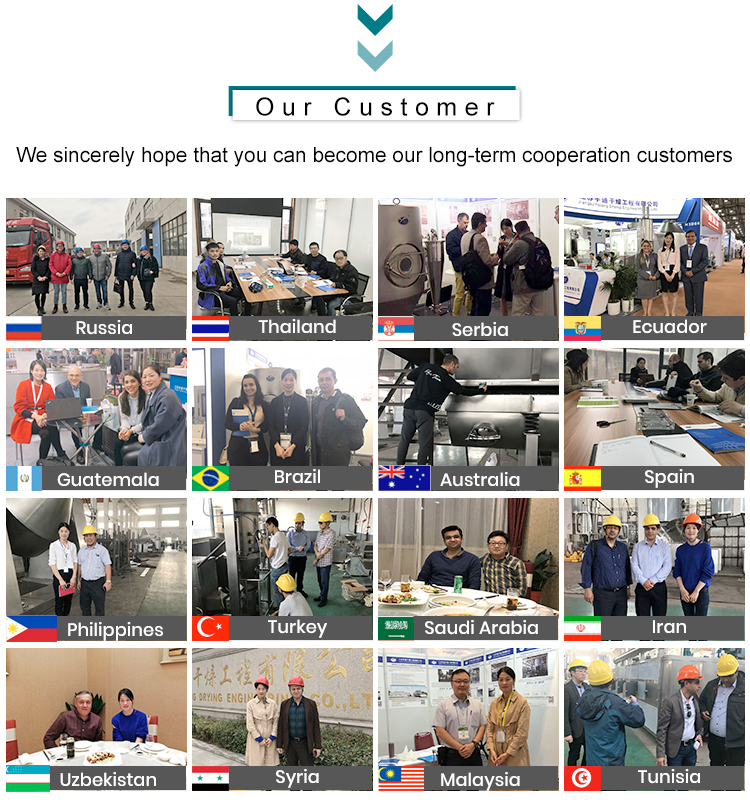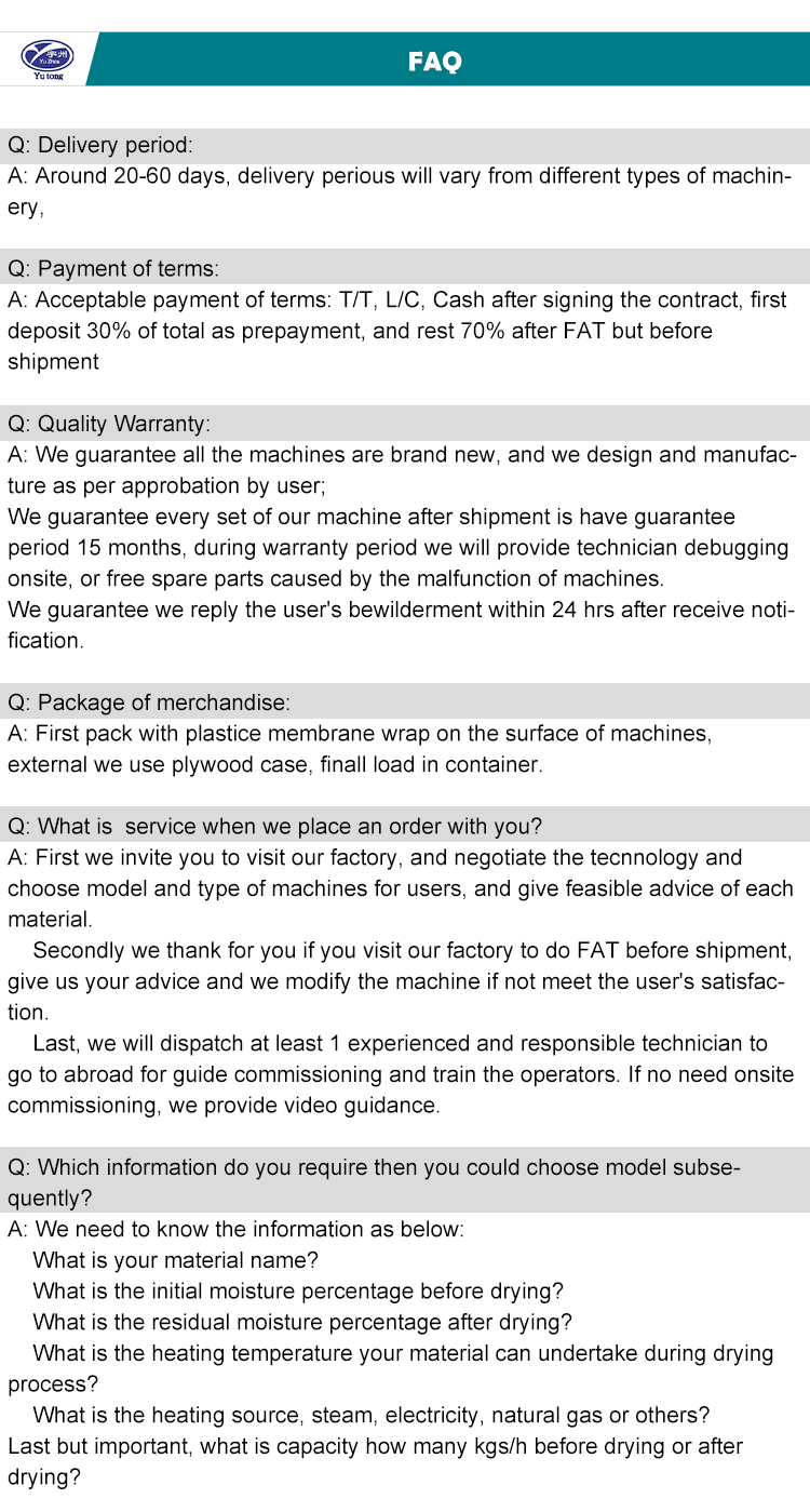 Q: Delivery time:A: About 20-60 days, the delivery time will vary for different types of machines,Q: Payment terms:A: Acceptable payment terms: T/T, L/C, Cash after signing the contract, first pay 30% of the total amount as prepayment, and the remaining 70% after FAT but before shipmentQ: Quality Assurance:A: We guarantee that all machines are brand new, and we design and manufacture according to the approval of users; we guarantee that each machine has a 15-month warranty period after delivery, during the warranty period we will provide technicians to debug Free spare parts due to machine failure. We promise to respond to user queries within 24 hours of being notified.Q: Product packaging:A: First wrap the machine surface with plastic film, outside we use plywood shell, and finally put it into the container.Q: What is the service when we place an order with you?A: First of all, we invite you to visit our factory, negotiate technology and choose the model and type of machine for users, and make feasible suggestions for each material. Secondly, if you come to our factory to do FAT before shipment, we thank you, give us your suggestion, if it can not satisfy the user's satisfaction, we will modify the machine. Finally, we will send at least 1 experienced and responsible technician to go abroad to guide debugging and train operators. If on-site commissioning is not required, we provide video guidance. Q: What information do you need to then choose a model? A: We need to know the following information: What is your material name? What is the initial moisture percentage before drying? What is the residual moisture percentage after drying? What heating temperature can your material withstand during drying? What is the heat source, steam, electricity, natural gas or other? Last but not least, what is the capacity in kg/hour before or after drying?
