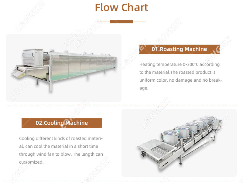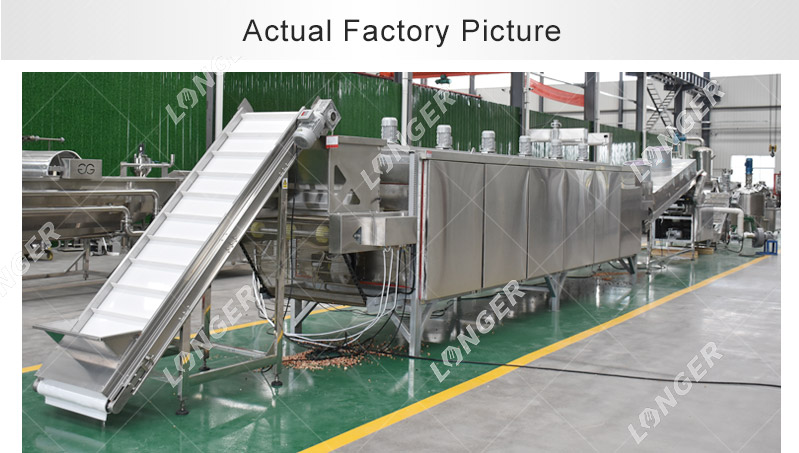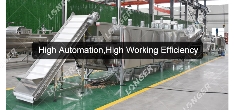 The production line includes peanut roaster, conveyor, cooler, peeler, grinder and mixer, etc. All production lines are automatic conveyors, which are easy to use and of good quality. The production capacity of the whole line is 500kg/h. It is an intermittent line, we also have a continuous line. There are also different capacity lines, such as 100kg/h, 200kg/h, 300kg/h, 1000kg/h, etc.