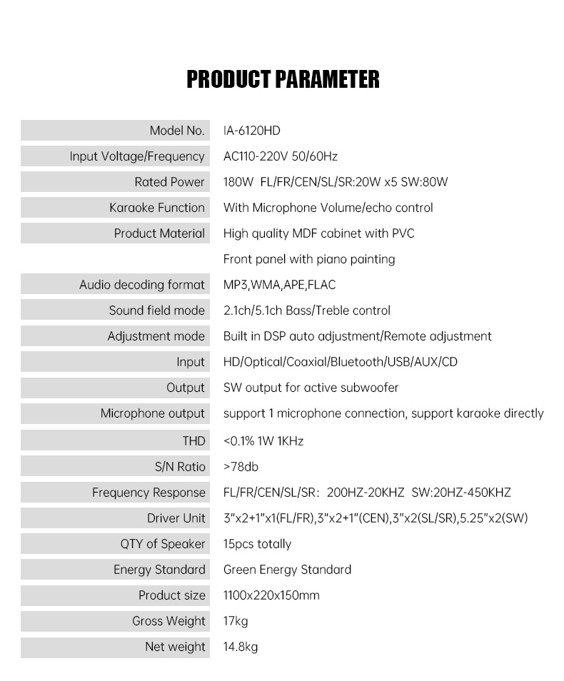 | Model: | IA-6120HD | RMS power: | 150W(20Wx5+50W) |