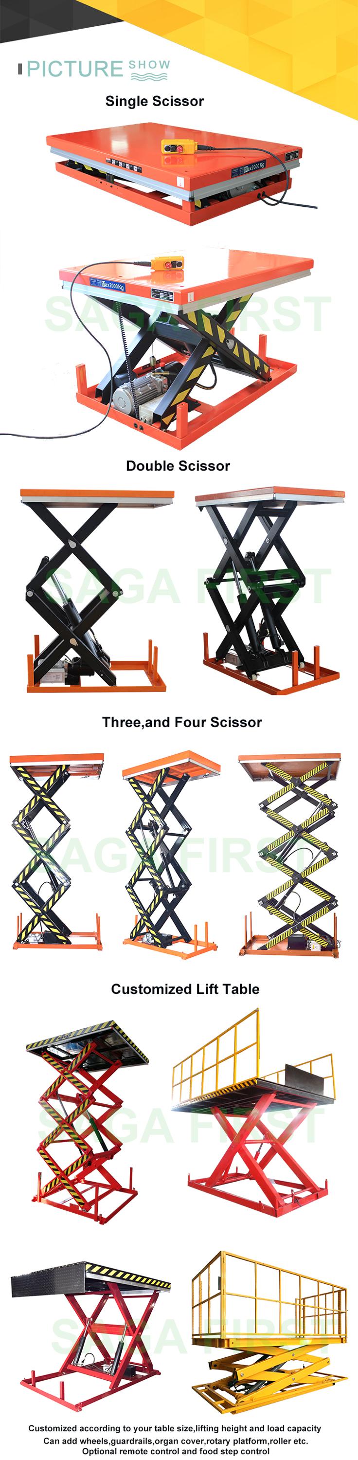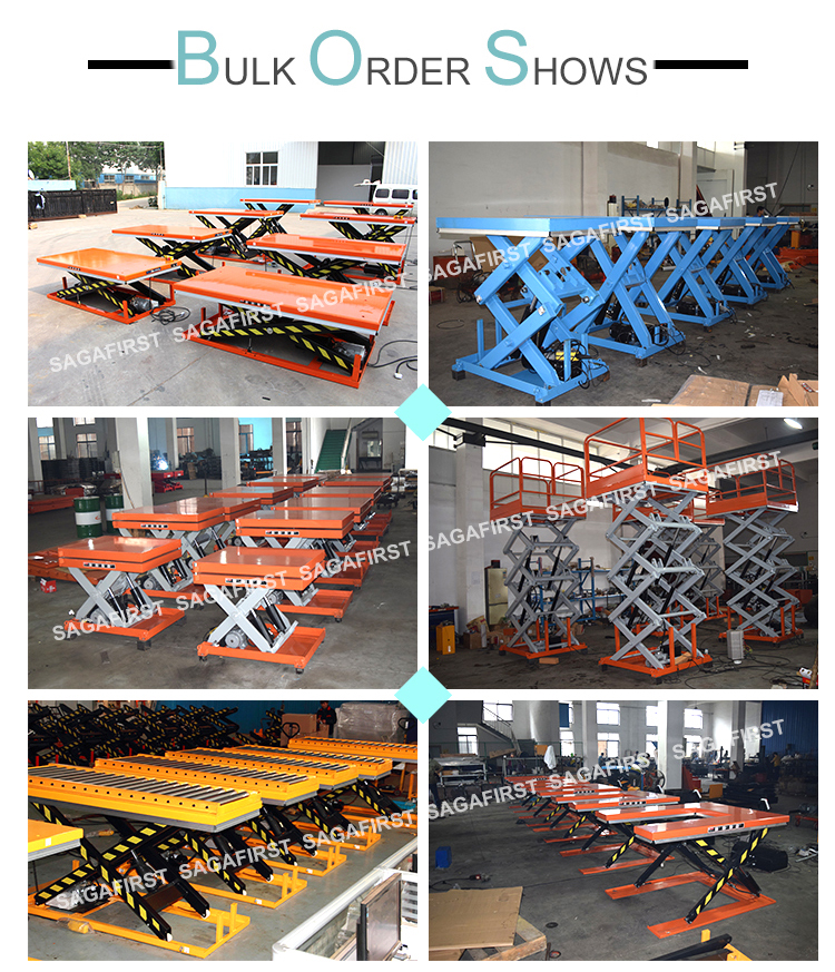 SAGAFIRST brandStandard scissor lift table is a high quality electro-hydraulic scissor lift with load capacity from 1,000KG to 50,000KG and lifting height up to 6m. We also accept custom platform dimensions and lift heights.