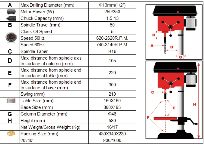 | Chuck Capacity: | 1.5-13mm; | Table size: | 160x160; |