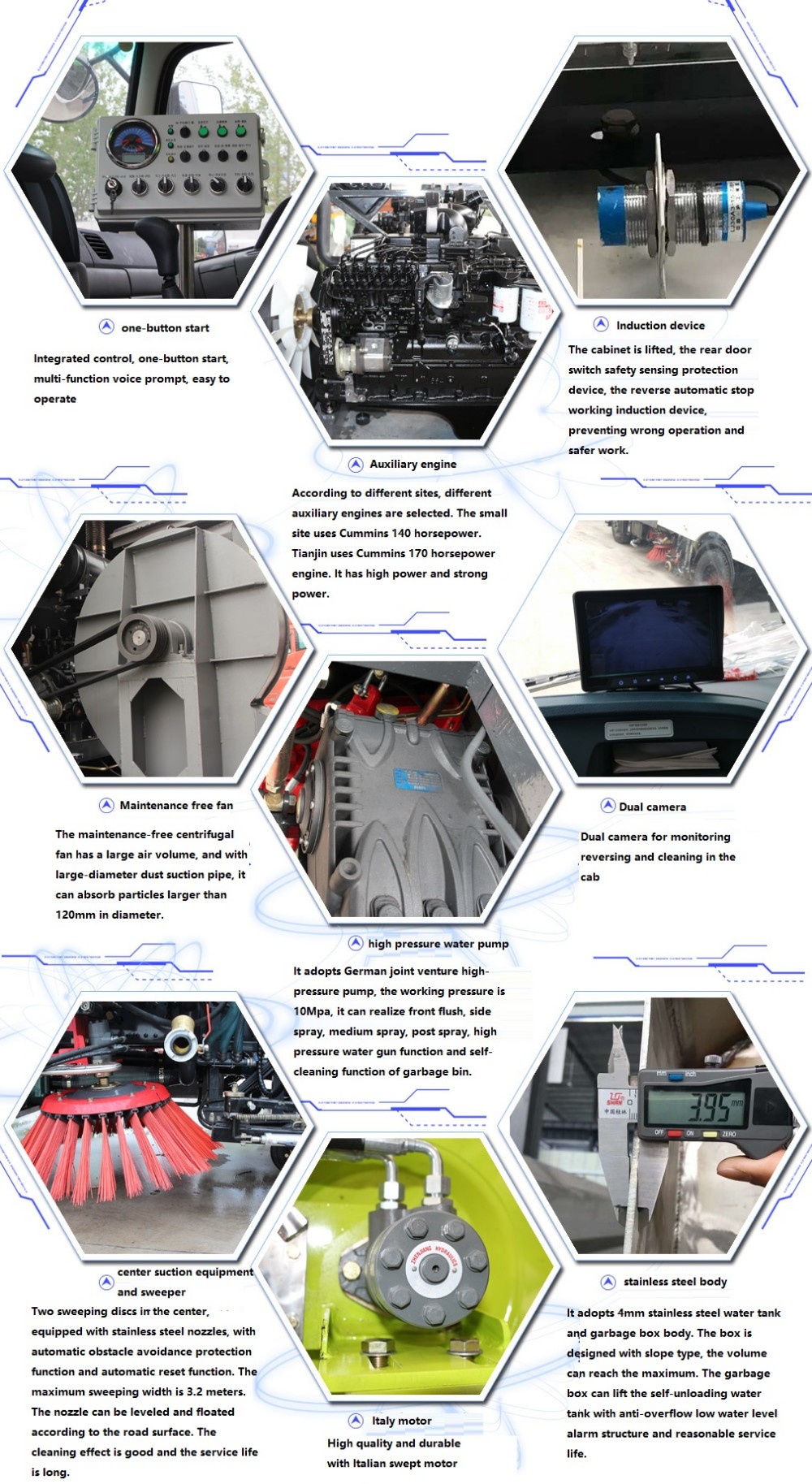 15. Equipped with advanced scanning TV monitoring equipment: There are observation probes on both sides and the rear of the vehicle to provide the operator with a clean state and rear image.