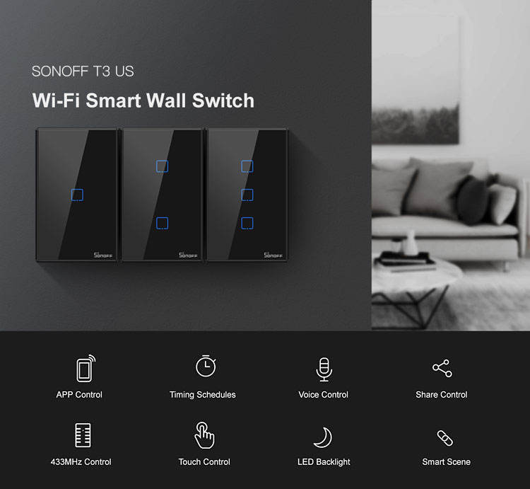 SONOFF T3 US Wifi smart wall switch can be controlled remotely by mobile phone, and the device connected with the switch can work independently. Works with Amazon Alexa and Google Assistant to let you turn appliances on or off with voice commands, perfect for those who need to do a lot of chores at the same time. One touch for easier control. Set a time for your devices, and switches will help you turn them on or off automatically. Tailor-made smart scenarios for your appliances. Just set up an event to trigger a SONOFF device or group of devices with just a tap of your phone. Your devices won't work due to an abnormal WiFi network, so LAN control is designed to make sure they work.