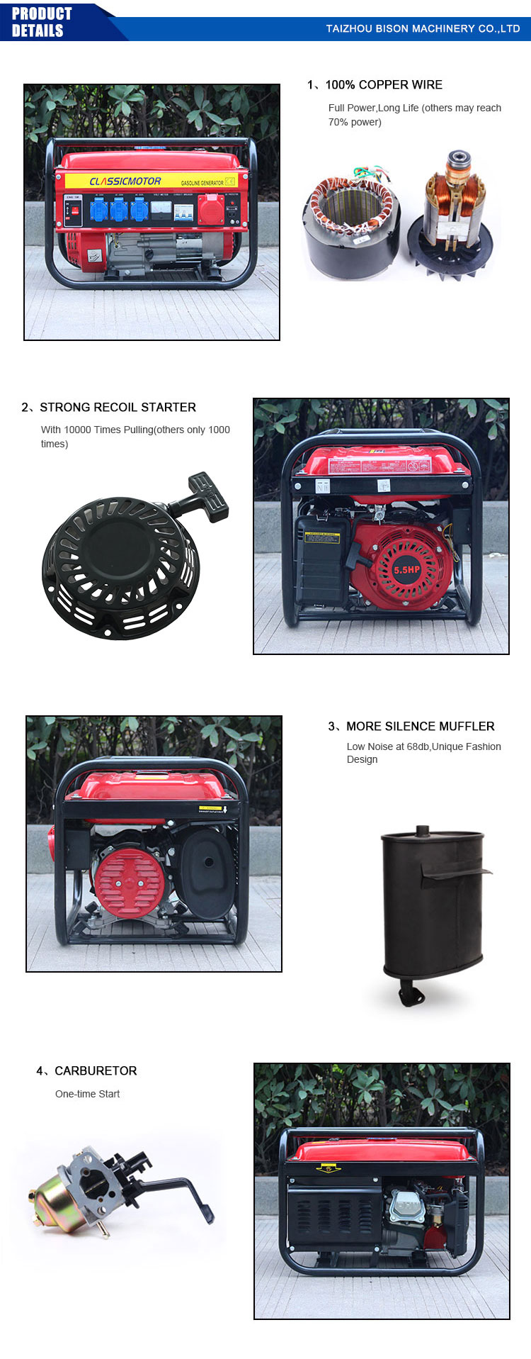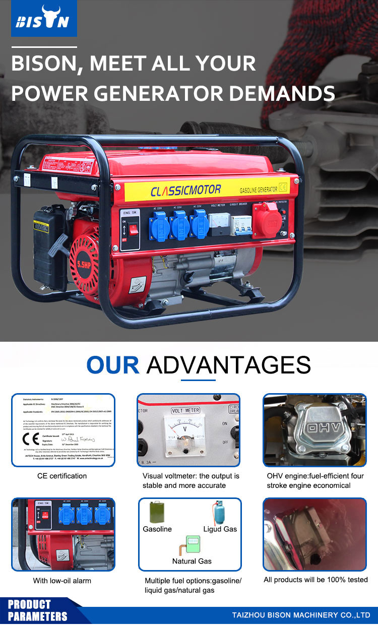 | Packaging Details: | Product passed durability test; drop test etc, then packed in brown sturdy carton and protected with plastic bag; fleece; foam. 1 Piece/Case, China OHV Gasoline Generator 5.5HP, Bison Portable 2.5kw Generator, Electric 3 Phase Gasoline Generator | Certification: | CE ISO9001 |