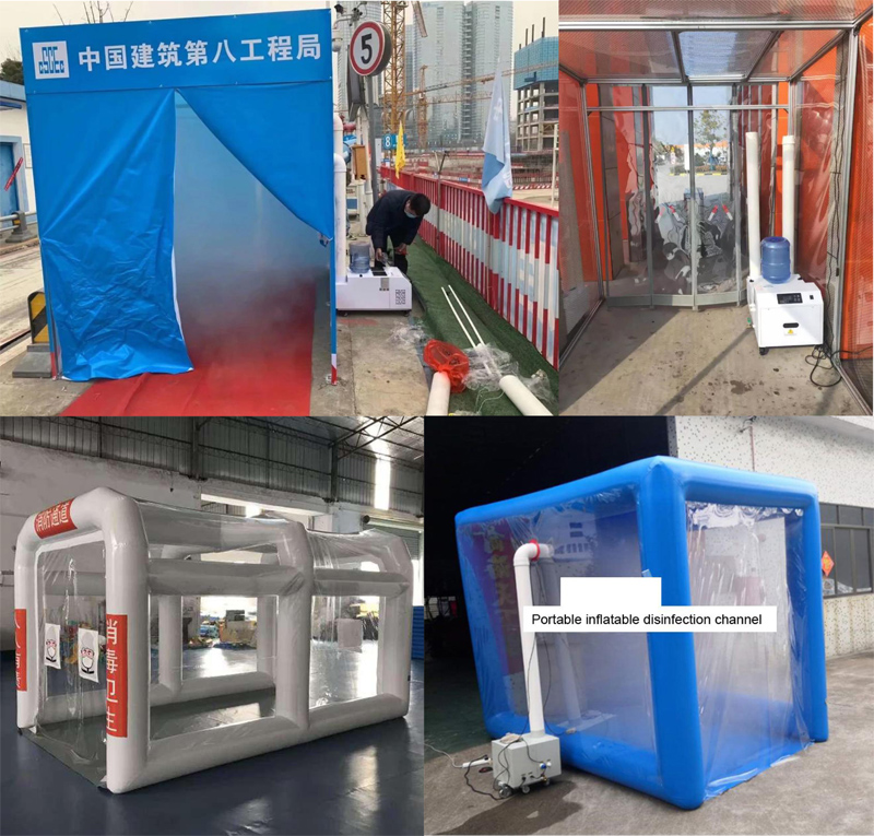 This machine can be used for disinfection of portable inflatable disinfection channels, tunnels or rooms. It is necessary to prepare a disinfectant mainly composed of sodium hypochlorite, which is generally diluted with 100 times of water, and soaked for 10-30 minutes during use.