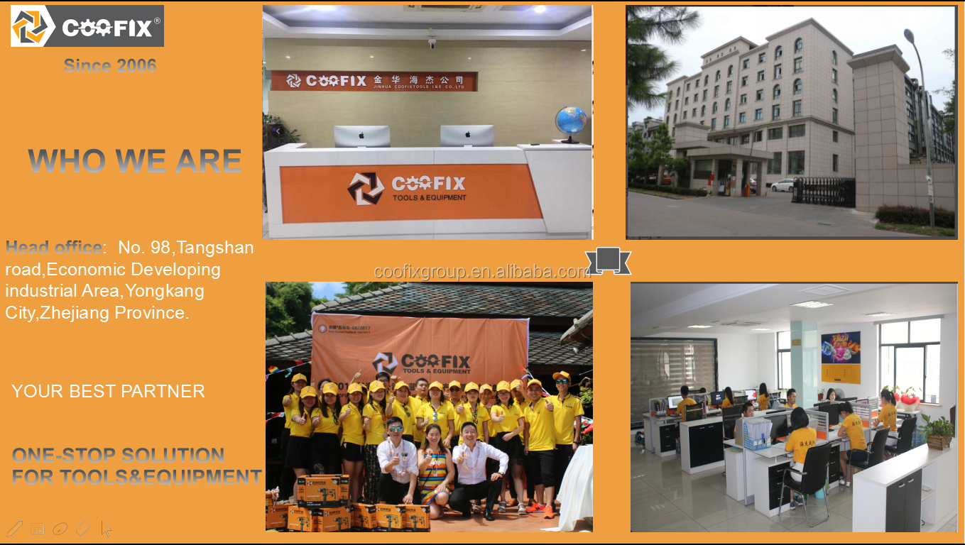 COOFIXTOOLS is committed to making professional quality tools. Bosch, Makita, Stanley and other well-known brands are all high quality and high price. COOFIX believes that top quality is not only function, usability and appearance, but also efficiency, performance and maintainability. The entire COOFIX team members pay great attention to every detail, making COOFIXTOOLS a global leader in the industry. All COOFIX team members are based in China headquarters and support global marketing. We focus on finding overseas partners instead of building our own sales team. Rather than doing a lot of advertising, we prefer to save on all the extra costs to maximize the benefit of our partners. COOFIX---Let the world be in your hands.
