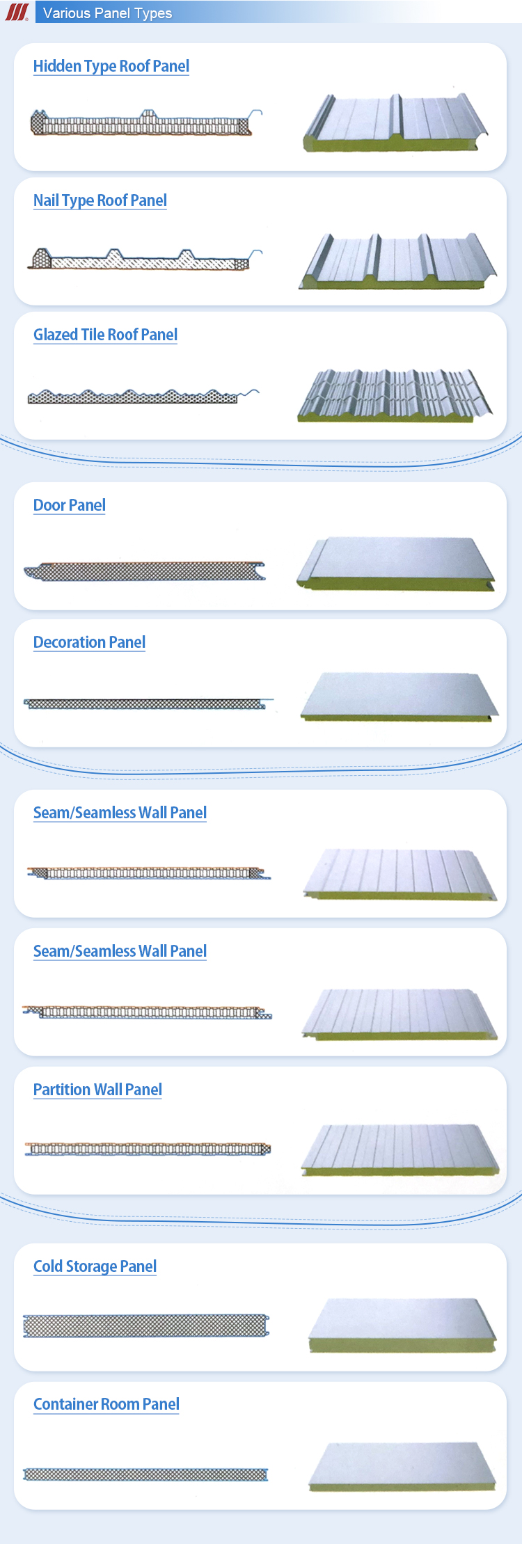 2 | suitable core material | Rock wool, polyurethane, PIR | According to customer requirements | |||