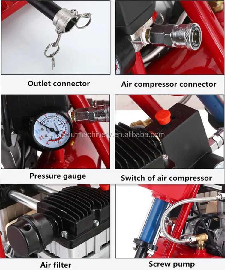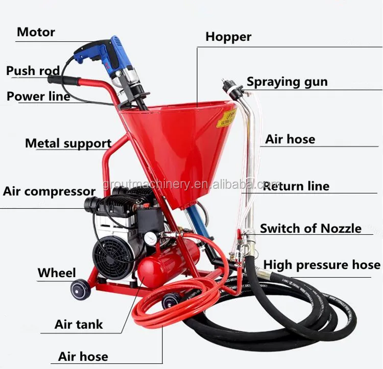 SP-1 portable wall putty spray machine is consist of screw pump, air compressor, hopper and air pump, it is suitable for spraying waterproof paints, fireproof coatings, putty, etc. which aggregate is less than 1mm.