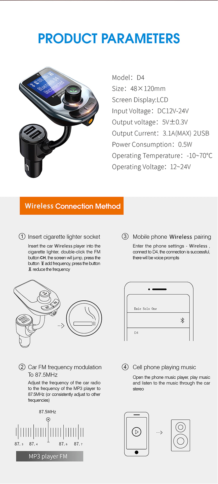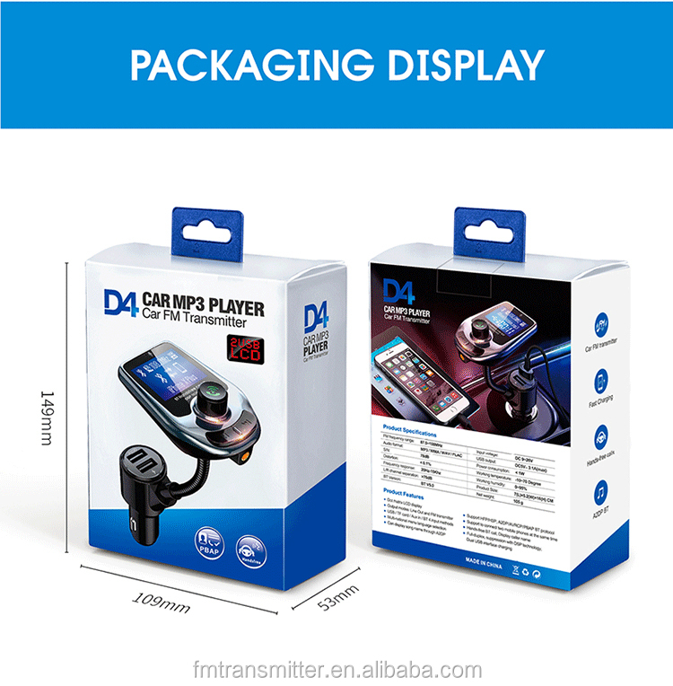 | USB output: | QC3.0/1.0A | product name: | D4 FM Transmitter Audio Car MP3 Player FM Modulator |