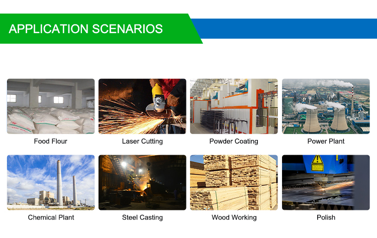 application:Air filters are used in food flour, laser cutting, powder coating, power plants, chemical plants, steel casting, woodworking, polishing, milk powder, shot blasting workshops, sinter distribution, toner mixing, steering wheel factory mixing, graphite power industry factories.