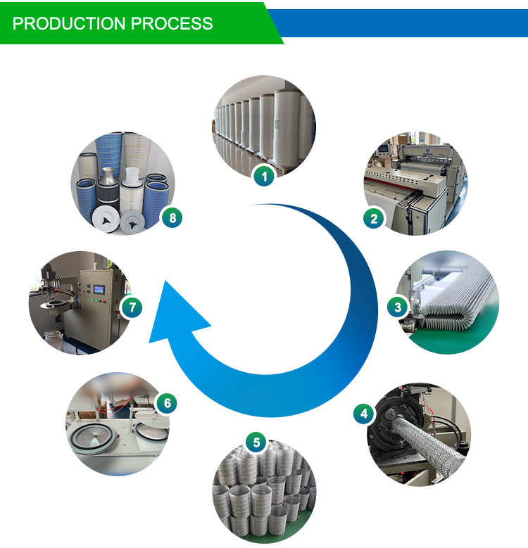 Production Process:Filtration material----pleat----ultrasonic melting----perforated mesh----EPDM ring gasket----gluing machine----detection----packaging