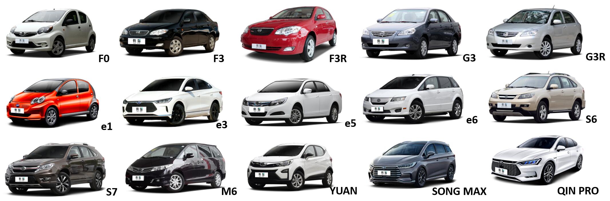 * BYD, F0/F3/F6/S6/S7/E6....