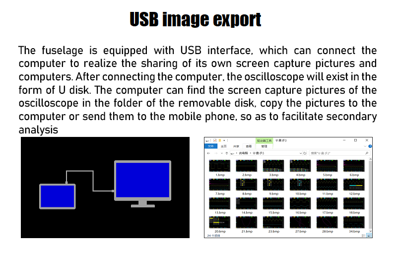 Equipped with a USB interface, it can be connected to a computer to share screenshots with the computer, which is convenient for secondary analysis.