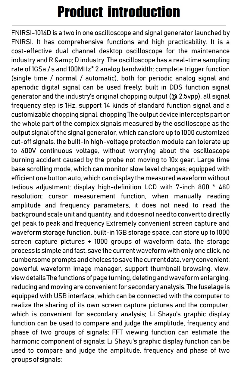 FNIRSI-1014D is a two-in-one oscilloscope and signal generator launched by FNIRSI. Comprehensive functions and strong practicability. It is a cost-effective dual-channel desktop oscilloscope for the maintenance industry and R&D industry. The oscilloscope has a real-time sampling rate of 1GSa/s and an analog bandwidth of 100MHz*2; complete trigger function (single/normal/automatic), both periodic analog signals and aperiodic digital signals can be used freely; built-in DDS function signal generator and The industry's original chopper output (@2.5vpp), the frequency step of all signals is 1Hz, and supports 14 standard function signals and customizable chopper signals. The chopper output device intercepts some or all of the complex signals measured by the oscilloscope as signals The output signal of the generator can store up to 1000 custom cut-off signals; the built-in high-voltage protection module can withstand continuous voltages up to 400V, so there is no need to worry about the oscilloscope burning accident if the probe does not move to 10 times. Large time base scrolling mode, which can monitor slow level changes; Equipped with efficient one-button automatic display of measurement waveforms without tedious adjustments; Displays a 7-inch high-definition LCD display with a resolution of 800*480; Cursor measurement function, manual reading When the amplitude and frequency parameters are used, there is no need to read the background scale unit and quantity, and the peak-to-peak value and frequency can be directly obtained without conversion. Very convenient screenshot and waveform storage function, built-in - 1GB storage space, can store up to 1000 screenshots + 1000 sets of waveform data , the storage process is simple and quick, save the current waveform with one key, no need for cumbersome prompts and selection to save the current data, very convenient; Powerful waveform image manager, support thumbnail browsing, viewing, viewing details page, delete, waveform zoom, Functions such as zooming out and moving are convenient for secondary analysis. The fuselage is equipped with a USB interface, which can be connected to a computer to share your own screenshots with the computer, which is convenient for secondary analysis; Li Shayu's graphic display function can compare and judge the amplitude, frequency and phase of two sets of signals; FFT view The function can estimate the harmonic components of the signal; Li Shayu's graphic display function can compare and judge the amplitude, frequency and phase of the two sets of signals;
