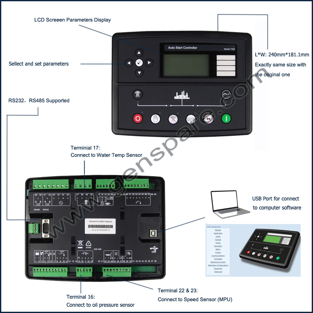 DSE7320DSE Genset Controlleris an automatic power (utility) fault control module for a variety of single, diesel or gas generator set applications. Monitoring a number of engine parameters, the module will display warning, shutdown and engine status information on a backlit LCD screen, illuminated LEDs, remote PC and text alerts via SMS (using an external modem).