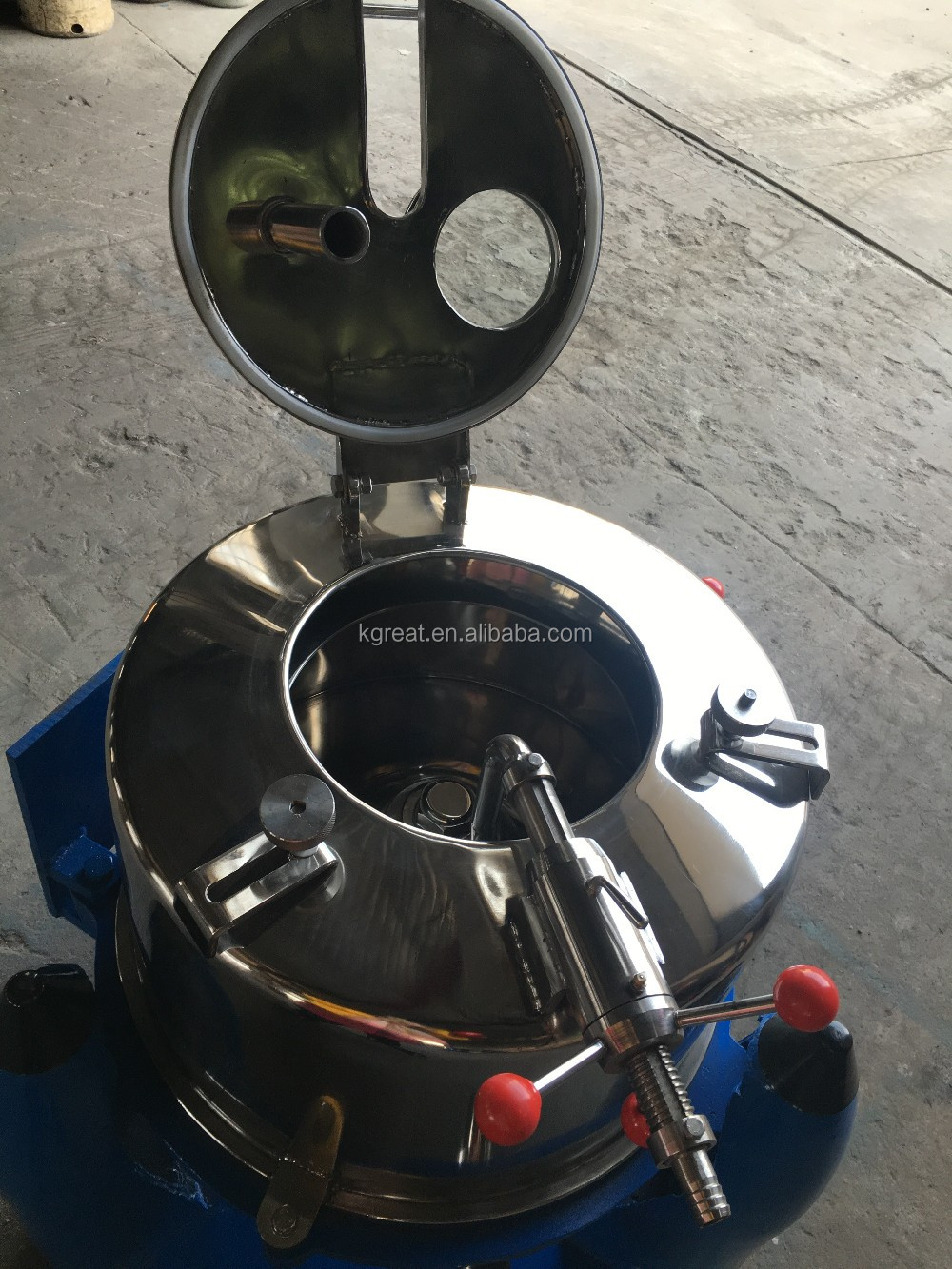 PTDC type centrifuge is a three-legged top discharge, intermittent operation sedimentation equipment. There are no holes on the drum. Under the action of centrifugal force, the heavier solid-phase materials are deposited on the drum wall to form a slag layer, and the light-phase materials form an inner liquid ring. The clarified liquid phase material can either overflow the baffle and flow out of the bowl, or be drawn out of the bowl through the skimmer during operation. After deceleration, the solid phase material can be scraped off by the scraping device.