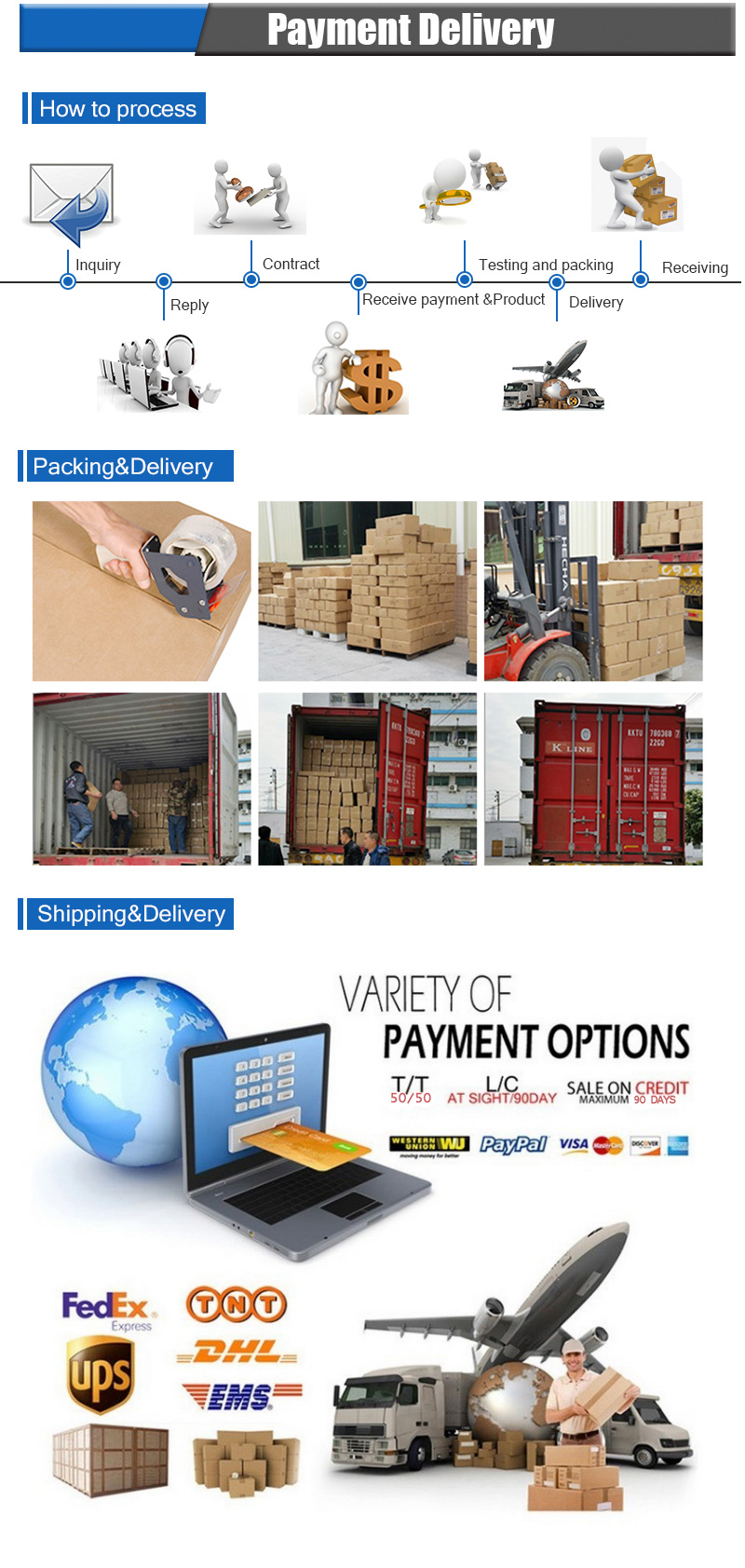 | Shipping method | DHL, Fedex, UPS, TNT, sea freight, air freight, etc. |