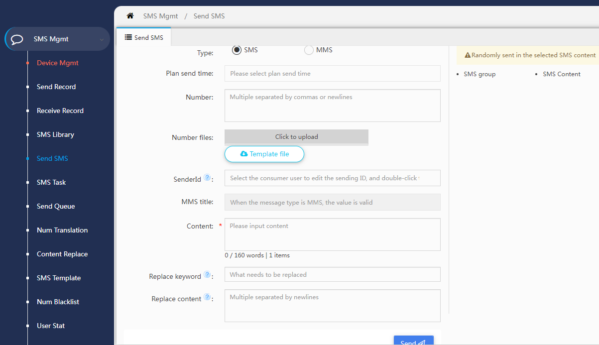 Maximum SMS sending speed 30,000-40,000 SMS/hour; instant SMS reception