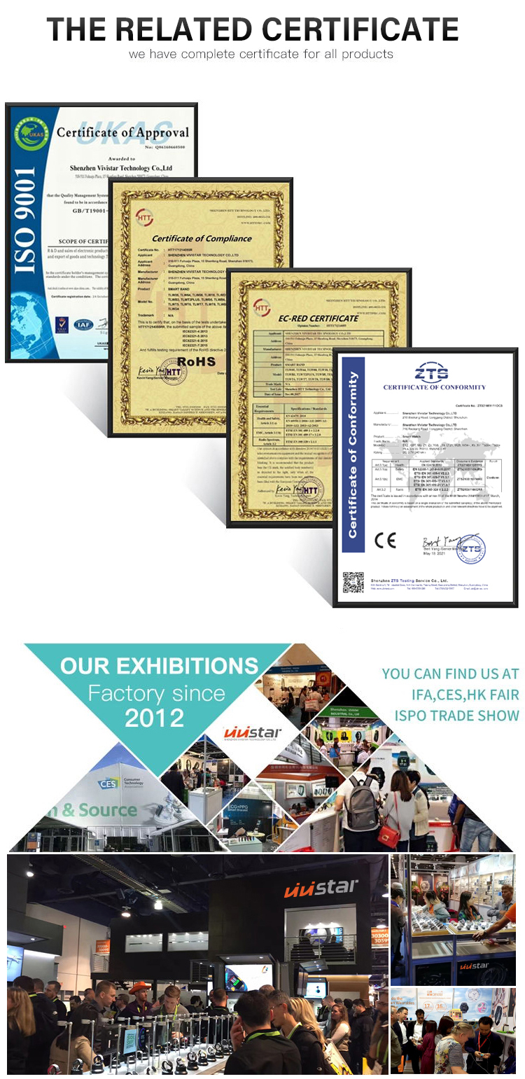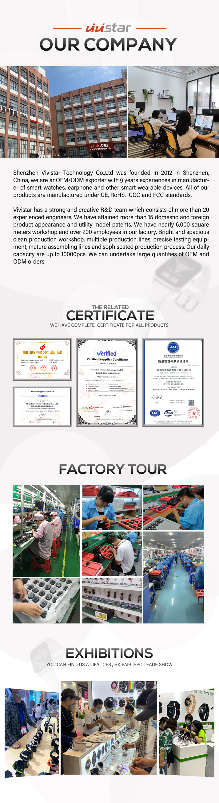 Shenzhen Vivistar Technology Co., Ltd. was established in Shenzhen, China in 2012, we are an OEM/ODM exporter with 7 years of experience in the manufacture of smart watches and other smart wearable devices. All our products are CE, RoHS, CCC and FCC compliant.