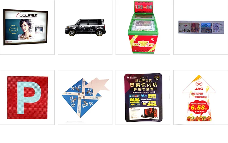 such as roll up display banner, X-banner stand, die cut waterproof car sticker, light poster,hanging vinyl banners etc.