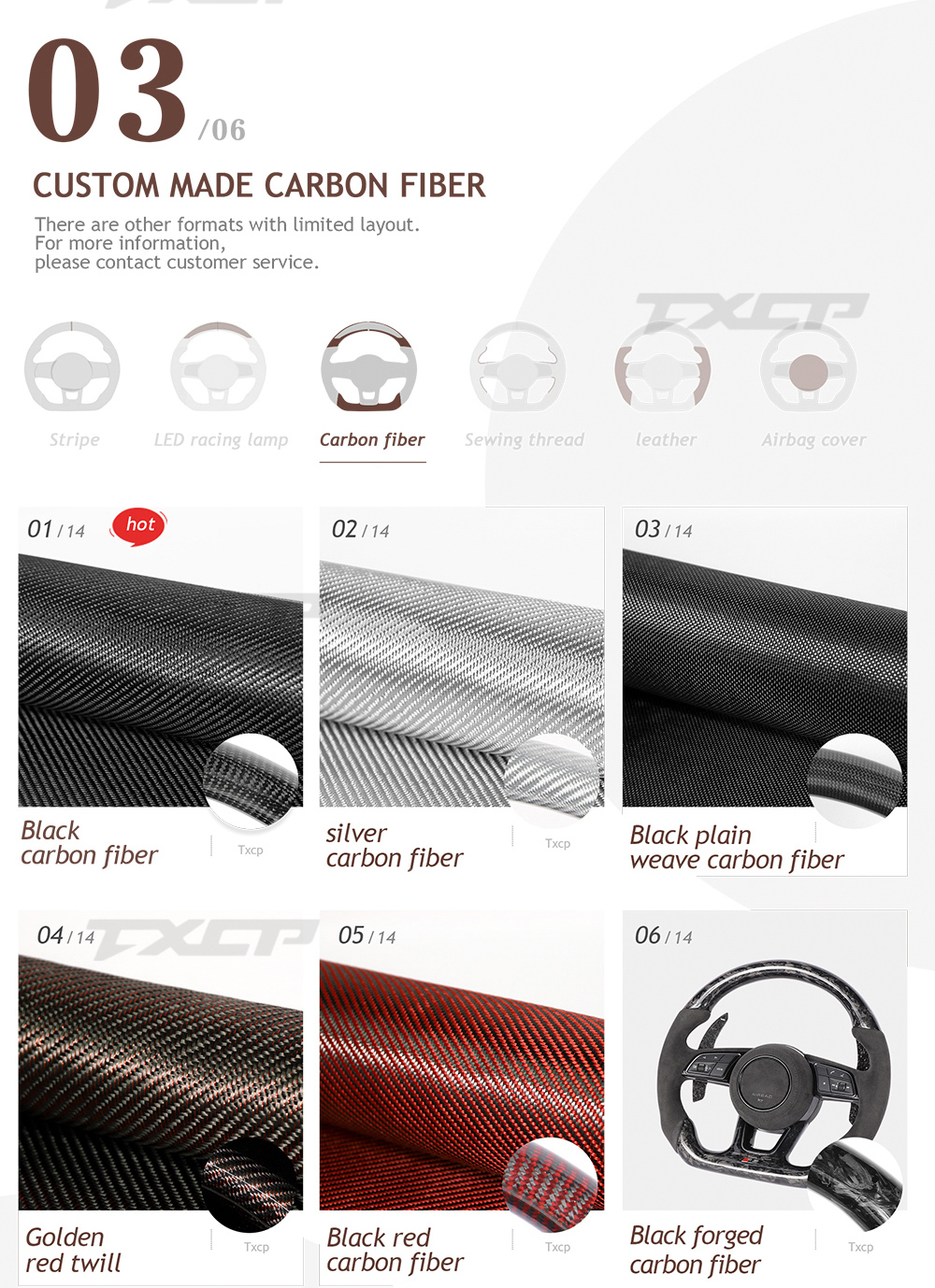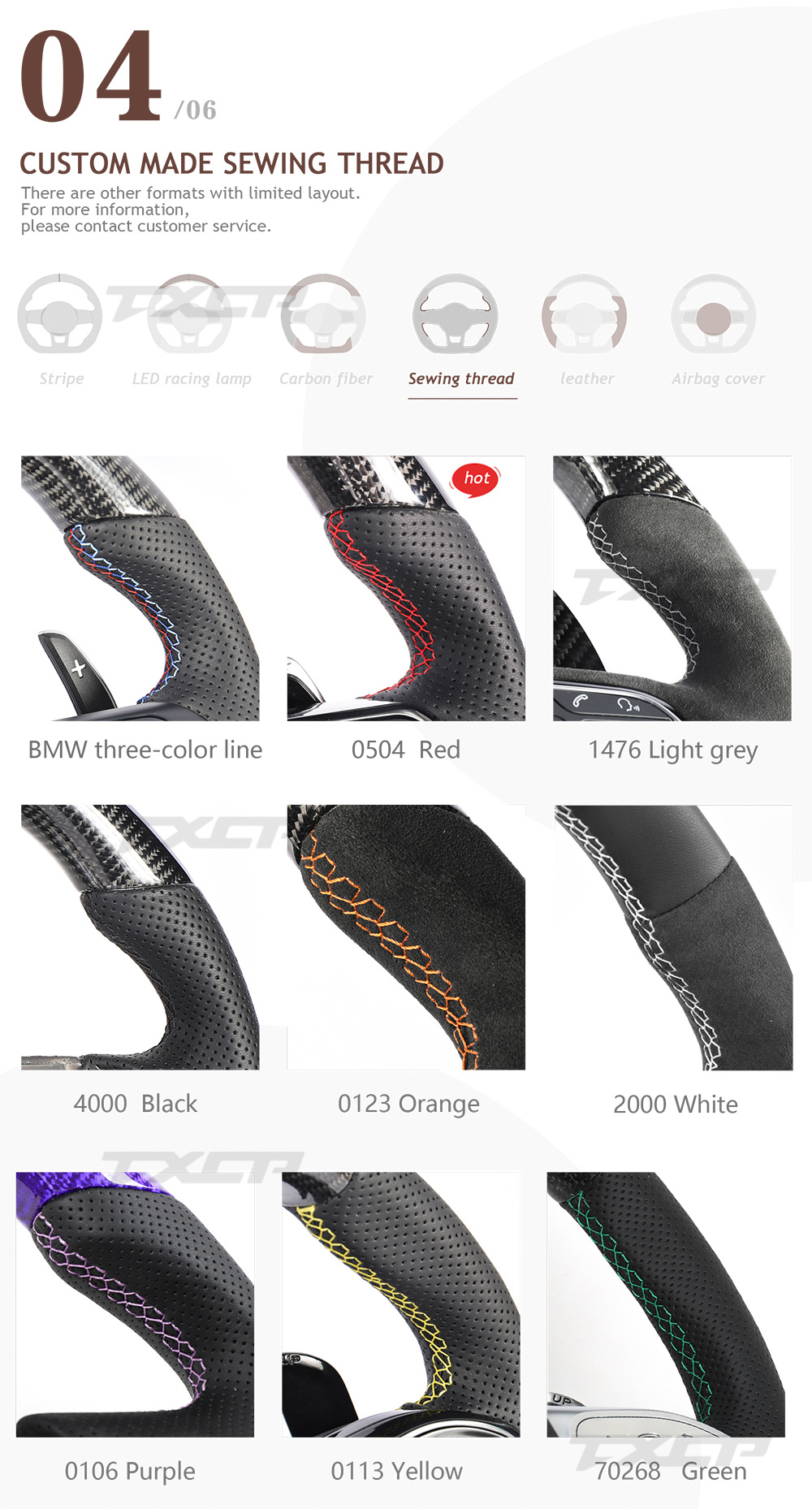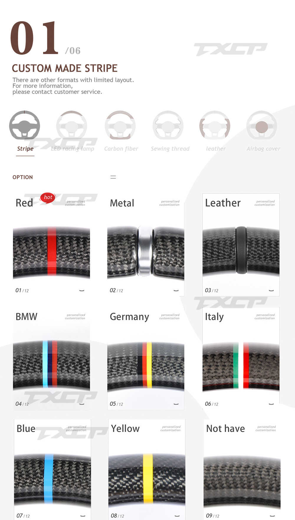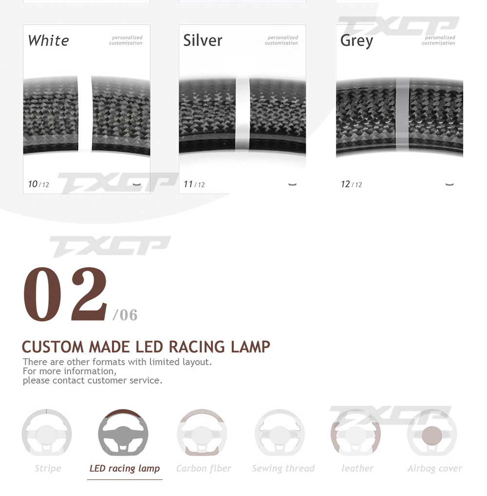 Accept customization, can customize carbon fiber color, leather color, stitching color, stripe color, etc. |