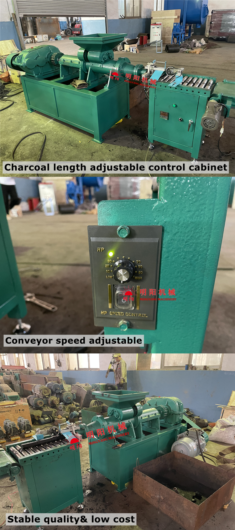 The final briquettes shape can be square, hexagonal, finger, cube (with cutting device) or any other shape according to your requirements. (Charcoal Stick Press).