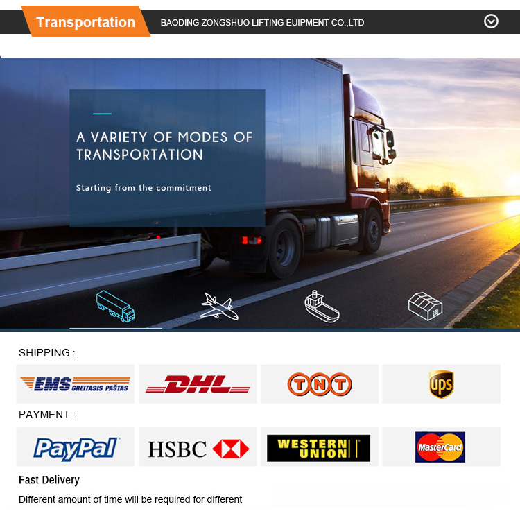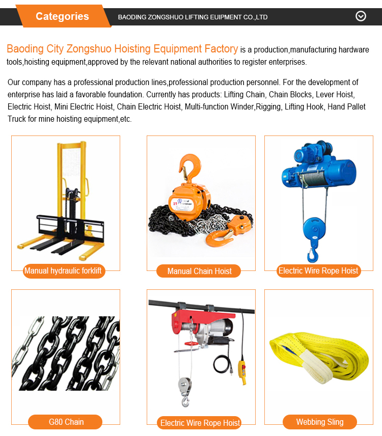 A: 1) We specialize in chain blocks, lever blocks, electric hoists, webbing slings, cargo lashings, hydraulic jacks, forklifts, micro cranes, etc. 2) Lifting accessories: load chains, wire ropes, rigging, hooks, pulleys and shackles.
