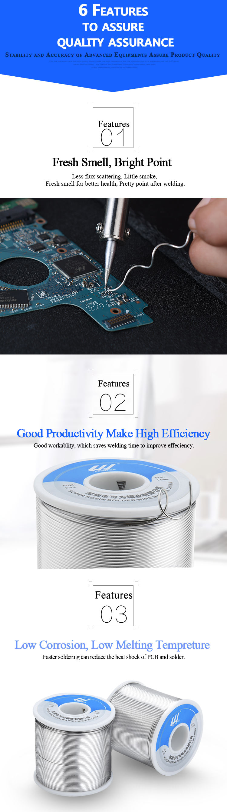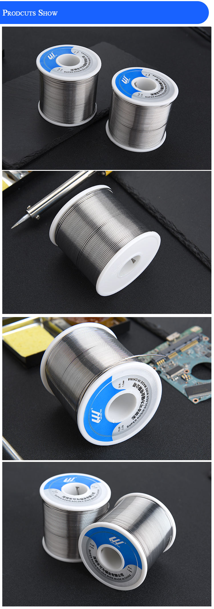 | Sn50Pb50 | 0.18-3.0 | 2.2-3.0 | 183-216 | 8.9 | Spool solder wire is suitable for the requirements of ordinary circuit boards, such as: welding of household appliances, electrical instruments, automotive electronics, hardware products and other products |
