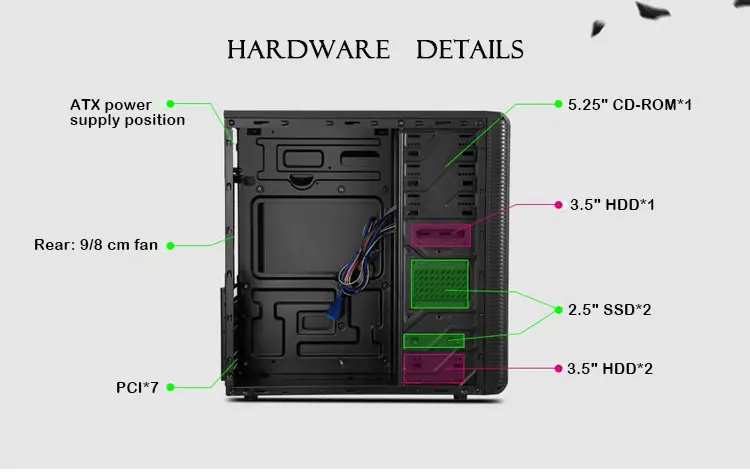 | HDD Bays: | 2*3.5 inch,1*SDD,1*FDD,2*2.5 inch; | AND structure: | SPCC0.4; |