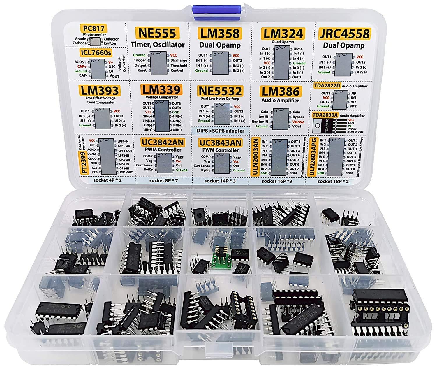 IC Classification 132 ICs and 18 IC sockets including ICs: PC817c, 20 pcs, DIP-4, Universal Optocoupler ICL7660s, 2 pcs, Super Voltage Converter, Charge Pump NE555, 20 pcs, DIP-8, Timer, Pulse generation, oscillator LM358, 10 pcs, DIP-8, low power dual op amp LM324, 10pcs, DIP-14, quad op amp JRC4558, 10 pcs, DIP-8, dual op amp LM393, 10 pcs, DIP- 14, Low Offset Voltage Dual Comparator LM339, 10 Pieces, DIP-8, Low Power Quad Comparator NE5532, 5 Piece, DIP-8, Dual High Performance Low Noise Operational Amplifier LM386m, 5 Piece, DIP-8 , Low Power Audio Amplifier TDA2030A, 2 pcs, TO-220, Five Watt Package Audio Amplifier TDA2822D, 5 pcs, DIP-8, Low Power Stereo Operational Amplifier PT2399, 3 pcs, DIP-16, CMOS Echo Audio Processor UC3842AN, 5 Piece, DIP-8, High Performance Current Mode Controller UC3843AN, 5 Piece, DIP-8, High Performance Current Mode Controller ULN2003AN, 5 Piece, DIP-16, Bipolar (BJT) Transistor Array 7 NPN Darlington 50V 500mA ULN2803APG, 5 pcs, DIP-18, Bipolar (BJT) Transistor Array 8 NPN Darlington 50V 500mA Included Sockets: DIP4 Socket, 2 pcs DIP8 Socket, 7 pcs DIP14 Socket, 3 pcs DIP16 Socket 3 pcs DIP18 Socket, 2 pcs DIP8 - SOP8 Through Hole to SMD Conversion Adapter, 1 pcs | ||