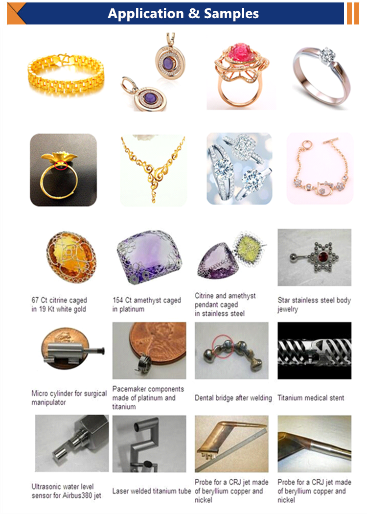 Laser spot welding machine is used inJewelry manufacturing, jewelry restoration, ring or bracelet sizing, gold and silver reworking, gem setting, eyeglass welding or restoration, denture welding, car parts weldingWait. Generally, it is especially suitable for precision welding of tiny targets. It is suitable for gold, platinum, titanium, silver, copper, nickel, aluminum, magnesium, stainless steel, etc.