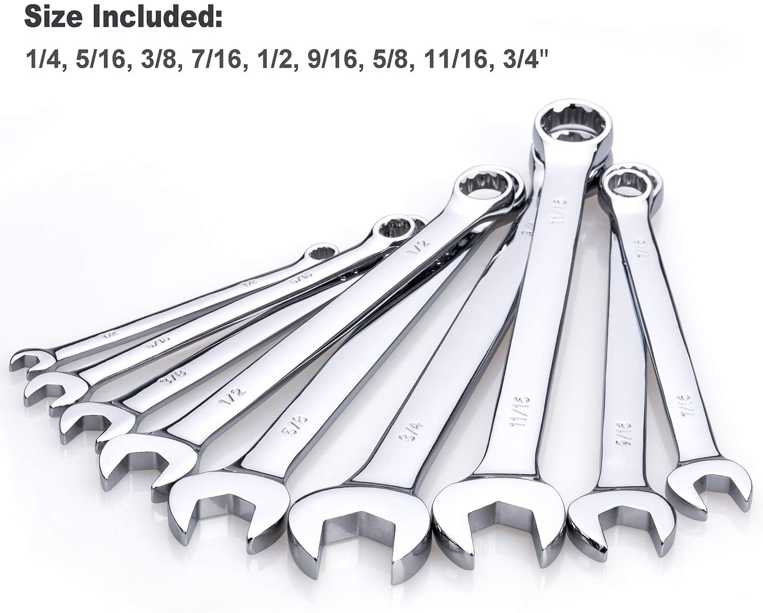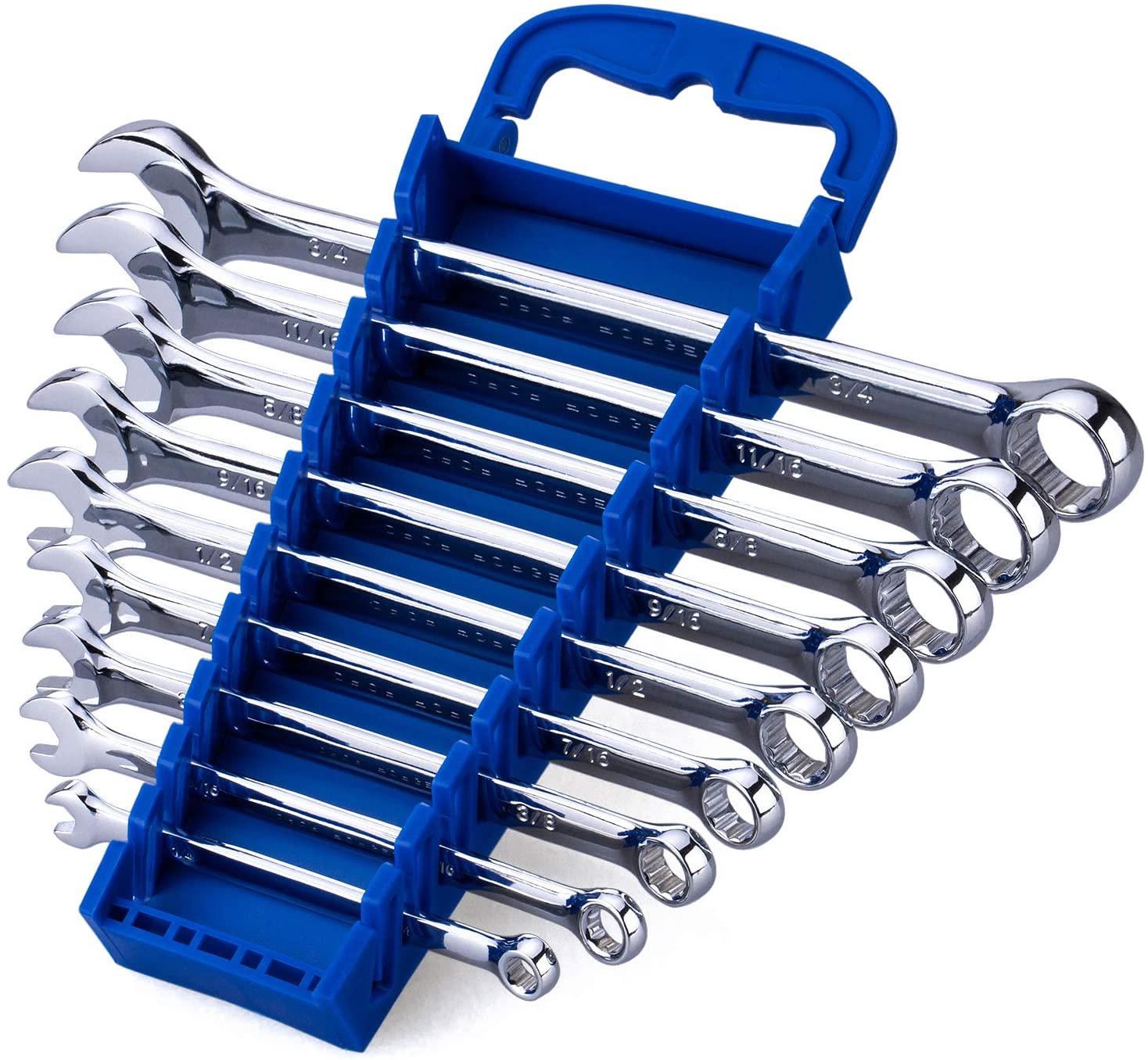 Available in SAE sizes from 1/4" to 1", this combination wrench set is stored and organized in