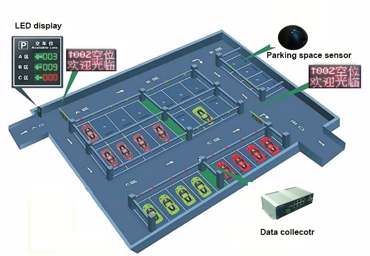 The intelligent parking lot sensor detection system includes two parts: sensor and data collector. The parking lot sensor is installed in each parking space, monitoringparking spaceReal-time data.