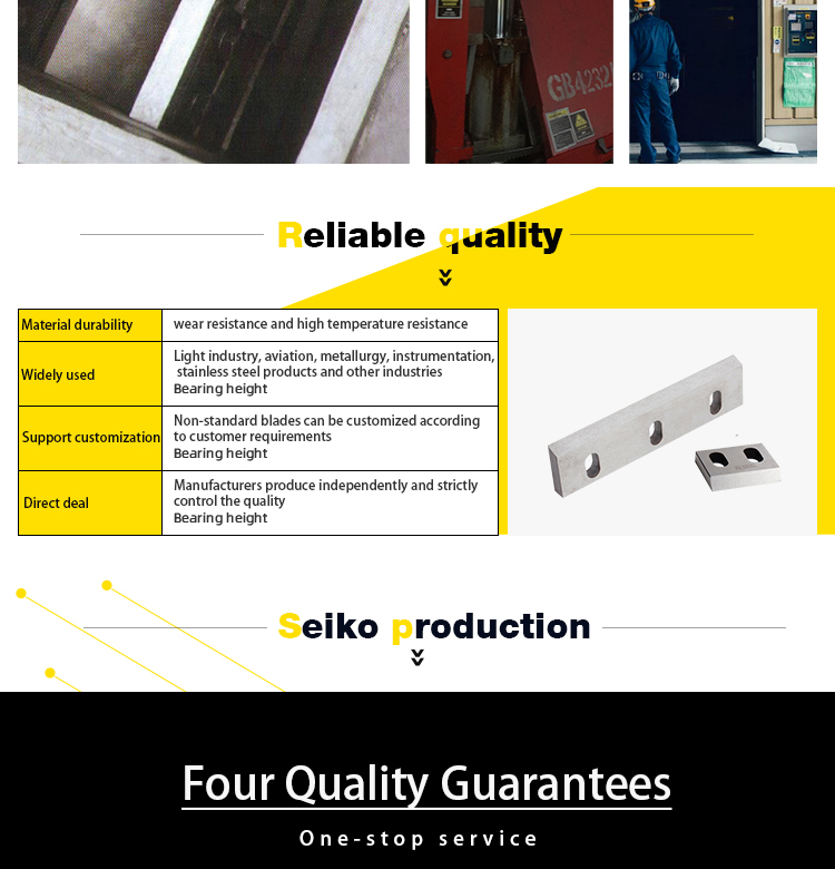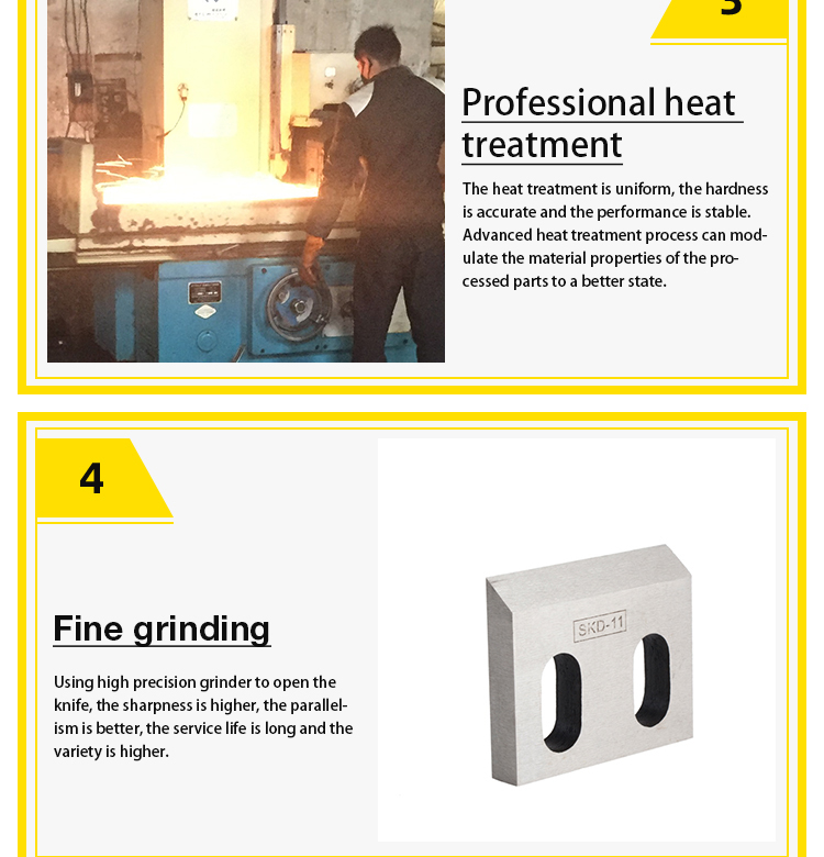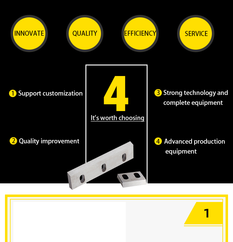 | broken knife Material: W-109(SK-5) D-2(SKD-11) M-2(SKH-51) TCT application: Suitable for crushing applications of plastic, rubber, paper, wood, food, minerals, etc. feature: M-2 (SKH-51) is mainly used for inlay, high quality, high hardness, low price, suitable for crushing soft plastic and rubber. Tool specifications can be made according to customer requirements. | ![]() |