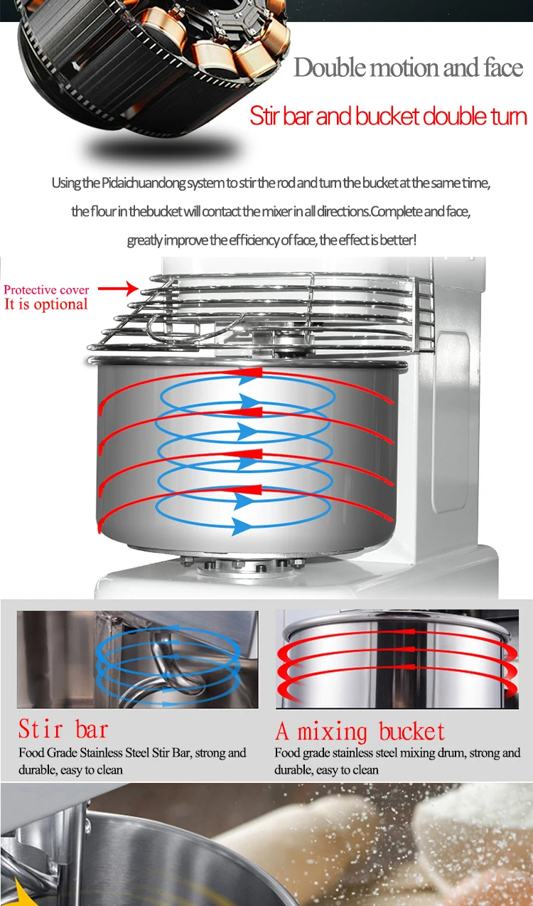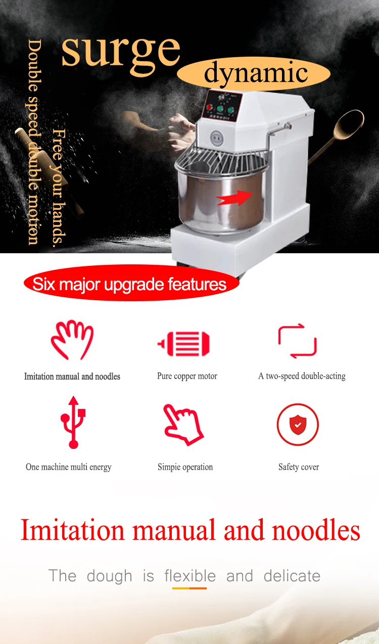 HS series double-acting mixing flour machine is a new type of mixing machinery.Their mixer rotates simultaneously with the material bucket,greatly accelerates the mixing speed,and improves the effect.The machine is equippped with security protection,features in convenient safety operation,and beautiful appearance and easy to clean.