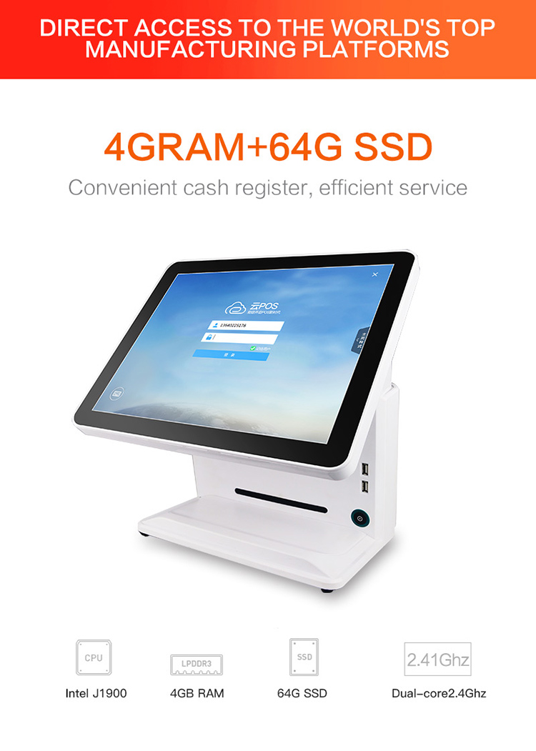| POS system CPU | Intel J1800 dual core dual thread 2.41GHz (i3/i5 optional) |