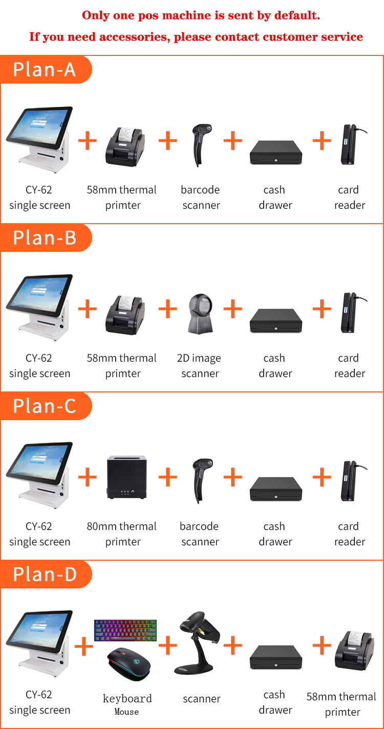 CY-62 pos machine adopts Intel J1900 dual-core dual-thread 2.41GHz, RAM 4G, SSD 64G. We not only consider the market's requirements for pos system, but also consider the customer's requirements for cost and configuration. WINDOWS user CY62 cash register can choose J1900, i3, i5, memory can choose 2G, 4G, 8G or 16G, and 32G, 64G, 128G or 256G SSD. If you need any customization of cash register, welcome to contact us. One