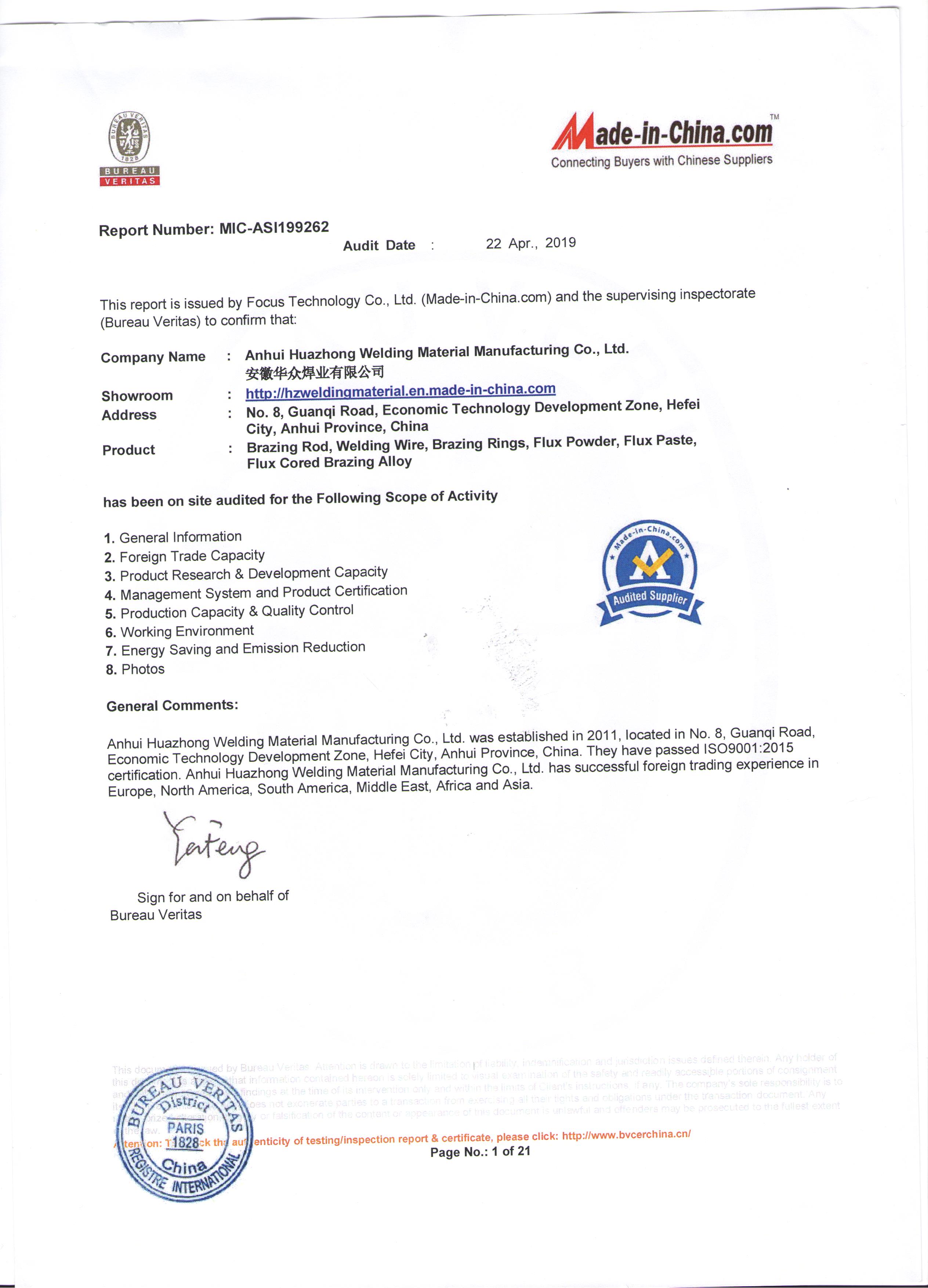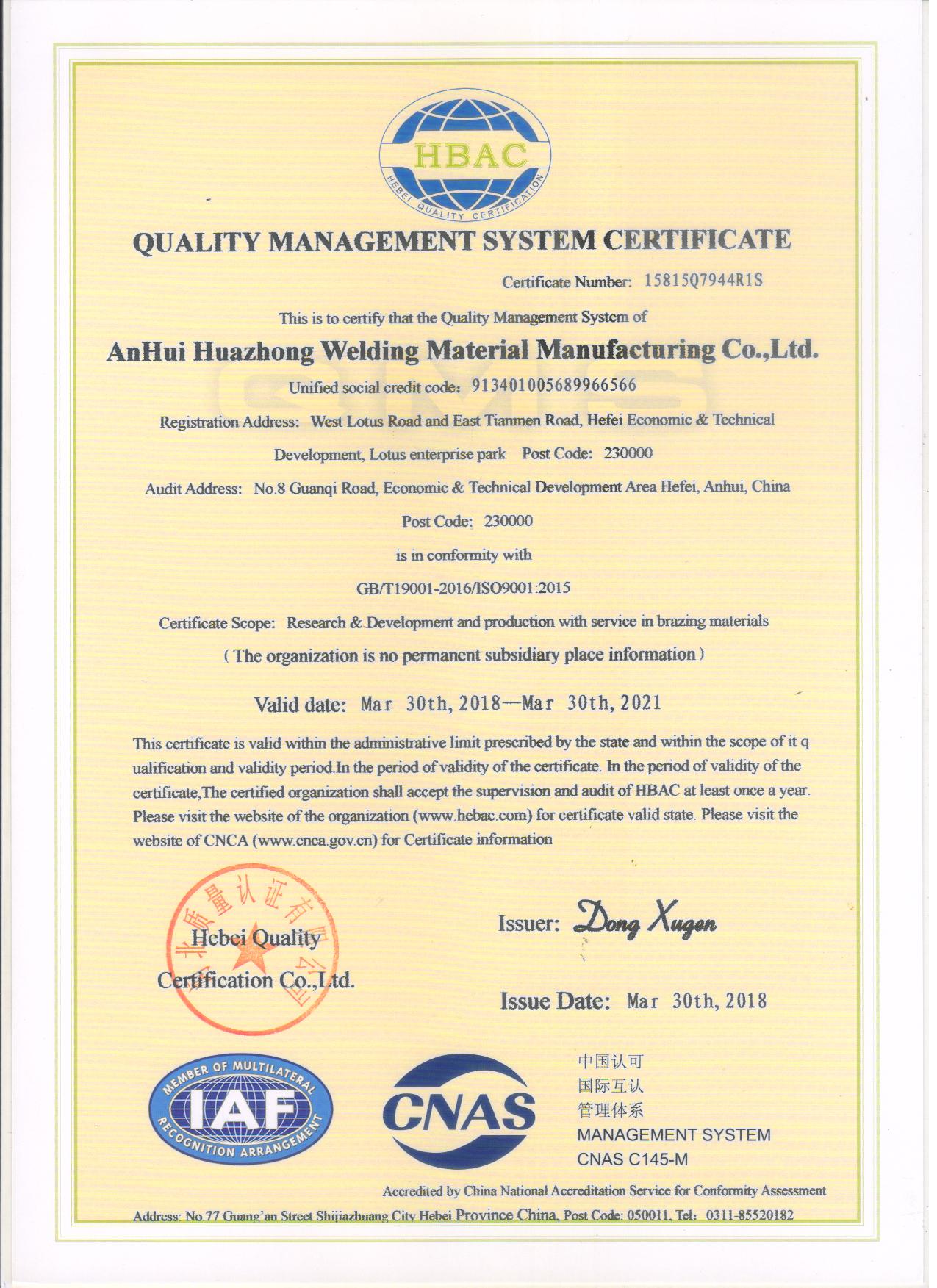 Anhui Huazhong Welding Materials Manufacturing Co., Ltd. was established in 2004 and has become a world leader in metal processing products for the brazing, welding, cutting and gas distribution industries. Located in Hefei, China's national science and technology center city, it has the most advanced testing equipment, professional production equipment, and national-level R&D personnel. Our main products include: silver-based solder, copper-based solder, aluminum-based solder, associated flux, flux-cored wire, etc. Brazing alloy forms include: round bar, flat bar, square bar, ring, wire, chaff, sheet, etc. In addition, we also supply silver solder paste and powder, copper solder paste and powder, aluminum solder paste and powder, etc. . For over a decade, we have operated globally, maintaining and expanding our reputation with our bespoke services, scientific standards and modern logistics. In order to further respond to the needs of our global customers, we have established 2 more subsidiaries: Anhui Nasha Import and Export Company and Anhui Huazhong New Material Technology Co., Ltd. Each company has passed ISO 9001 quality management system certification.