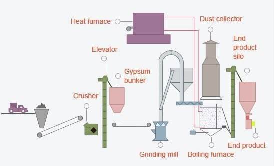 Gypsum powder production line is to produce gypsum powder that matches with gypsum board.The gypsum powder production line using natural gypsum as raw material is equipped with a variety of advanced technical equipment at home and abroad. The powder is classified by a classifier. The qualified powder that meets the required fineness is sent to the calciner, and the unqualified powder is returned to the mill for further processing. Gypsum powder, commonly known as plaster of paris, is stored in finished silos and used to make gypsum board stock.