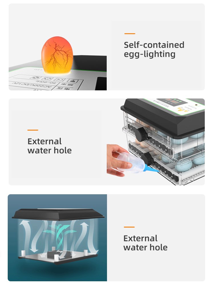 64 eggs 42 duck eggs 32 goose eggs 96 pigeon eggs 160 quail eggs | 52*23*46CM | 4.4KG | 80W | optional |